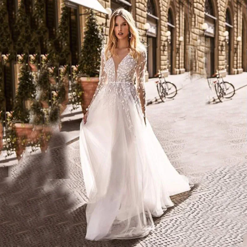 Платье свадебное с V-образным вырезом, длинным рукавом и кружевной ...
