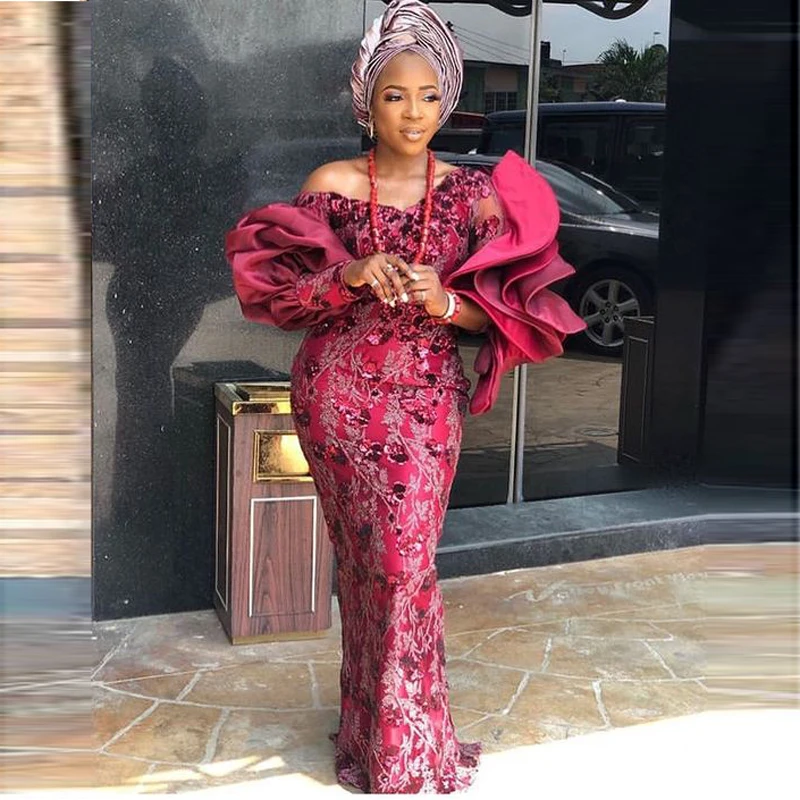 В африканском стиле большой размер, Размеры вечерние платья с v-образным вырезом с оборками с длинными рукавами с кружевной аппликацией Русалка платье для выпускного вечера; Aso Ebi; Vestidos De Fiesta