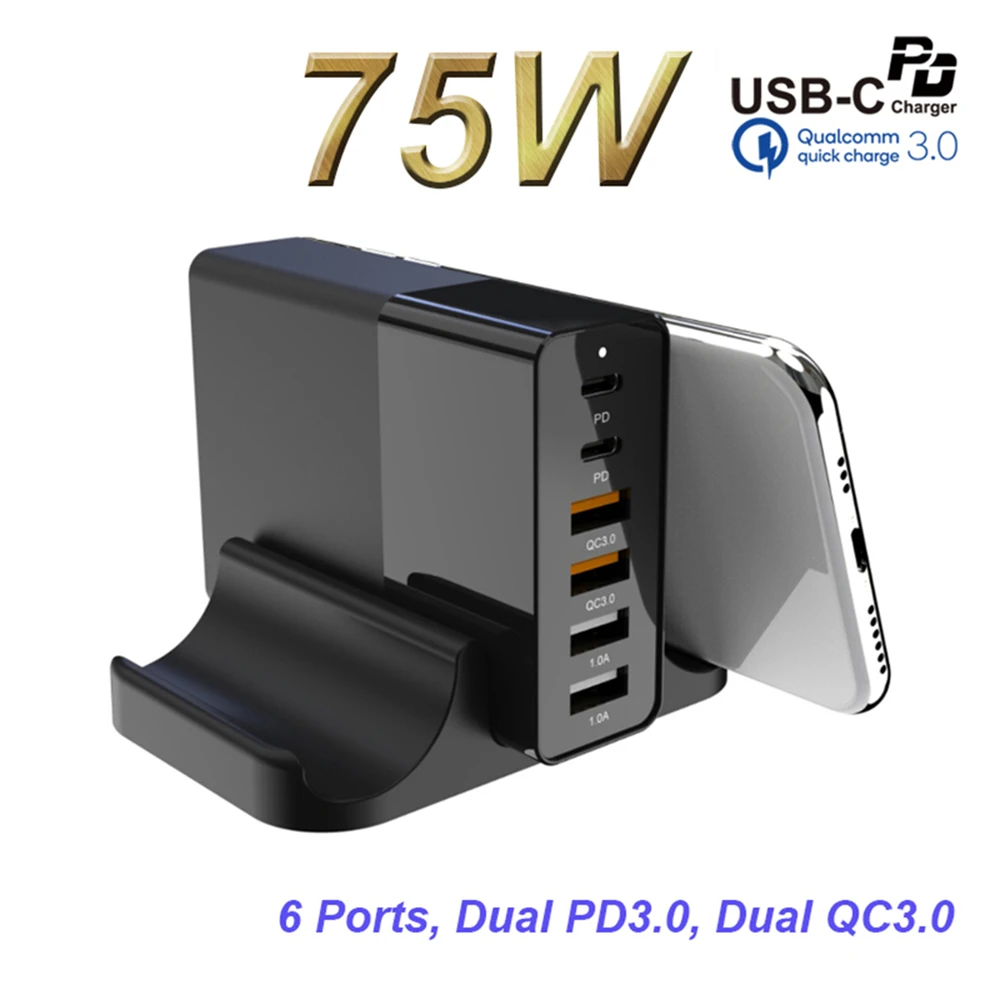 ILEPO 75W 6 портов USB зарядное устройство PD QC3.0 65 Вт мощность доставки Тип C зарядное устройство аксессуары для быстрой зарядки iPhone 11 12 XS Mini Pro
