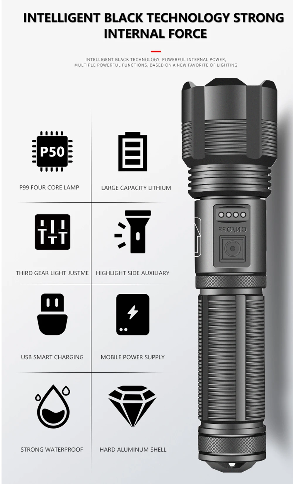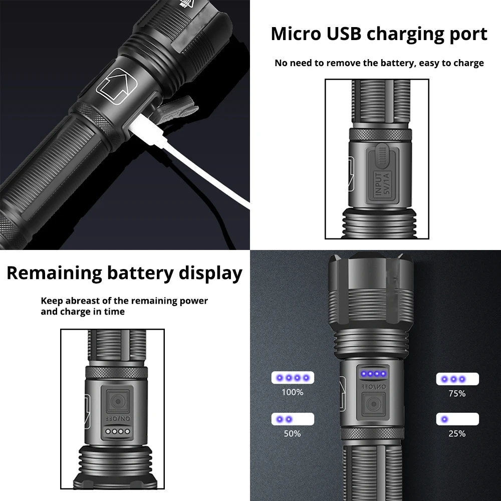 1. Оснащен лампами серии XHP, яркость одной лампы XHP50 больше 4 лампочек T6.2. Идеально подходит для охоты, приключений и других видов активного отдыха.3. Этот продукт имеет функцию напоминания, вы можете знать статус питания фонарика в любое время, в любом месте4. Водонепроницаемый в соответствии с IPX-6, водонепроницаемый, может использоваться в дождь, но не может быть помещен в воду5. Дисплей емкости аккумулятора, Micro usb к компьютеру USB, USB для автомобиля, USB разъем для зарядки, зарядный фонарик.6. Подходит для работы, охоты, альпинизма, рыбалки, кемпинга и активного отдыха и т. д.(4-х ядерный P50 и P70 доступны)A: 1x светодиодный фонарик 1x USB кабель для зарядкиB: 1 светодиодный фонарик 1 usb-кабель для зарядки 1 Высококачественная батарея 18650C: 1x светодиодный фонарик 1x USB кабель для зарядки 1x Высокое качество 18650 батарея 1x USB разъем (ЕС/США/Великобритания/Австралия)D: 1x светодиодный фонарик 1x USB кабель для зарядки 1x Высокое качество 18650 батарея 1x USB разъем (EU / US / UK / AU) 1x подарочная коробкаE: 1x светодиодный фонарик 1x USB кабель для зарядки 1x Высокое качество 18650 батарея 1x USB разъем (EU / US / UK / AU) 1x USB Автомобильное зарядное устройствоF: 1x светодиодный фонарик 1x USB кабель для зарядки 1x Высокое качество 18650 батарея 1x USB разъем (EU / US / UK / AU) 1x Подарочная коробка 1x USB Автомобильное зарядное устройство