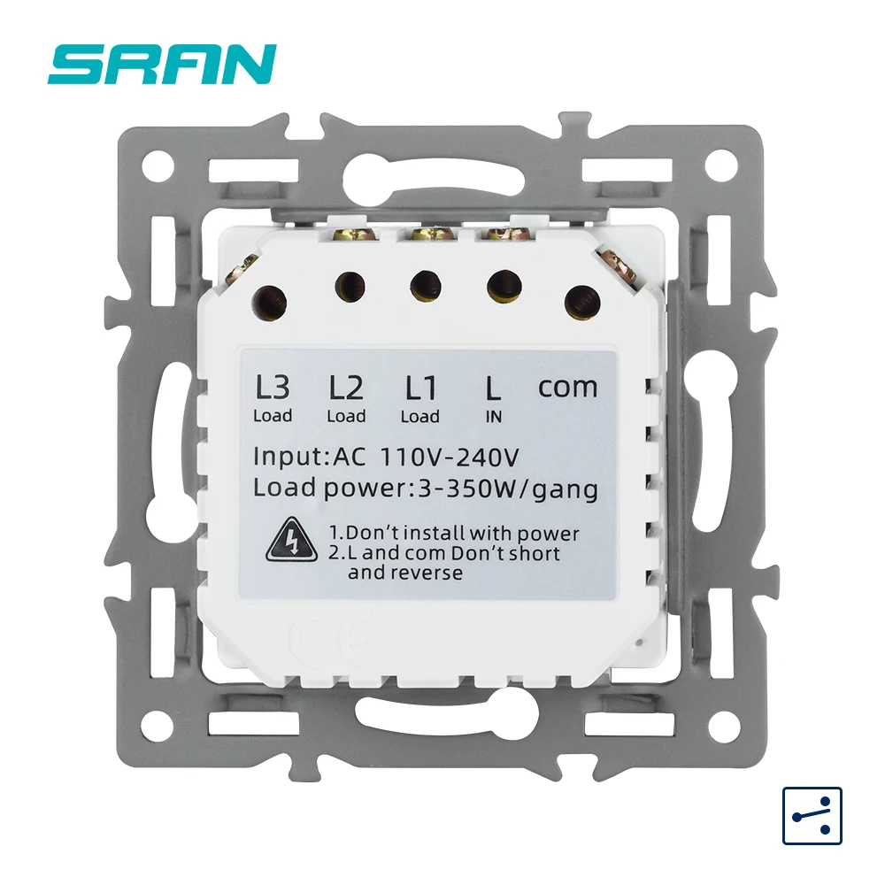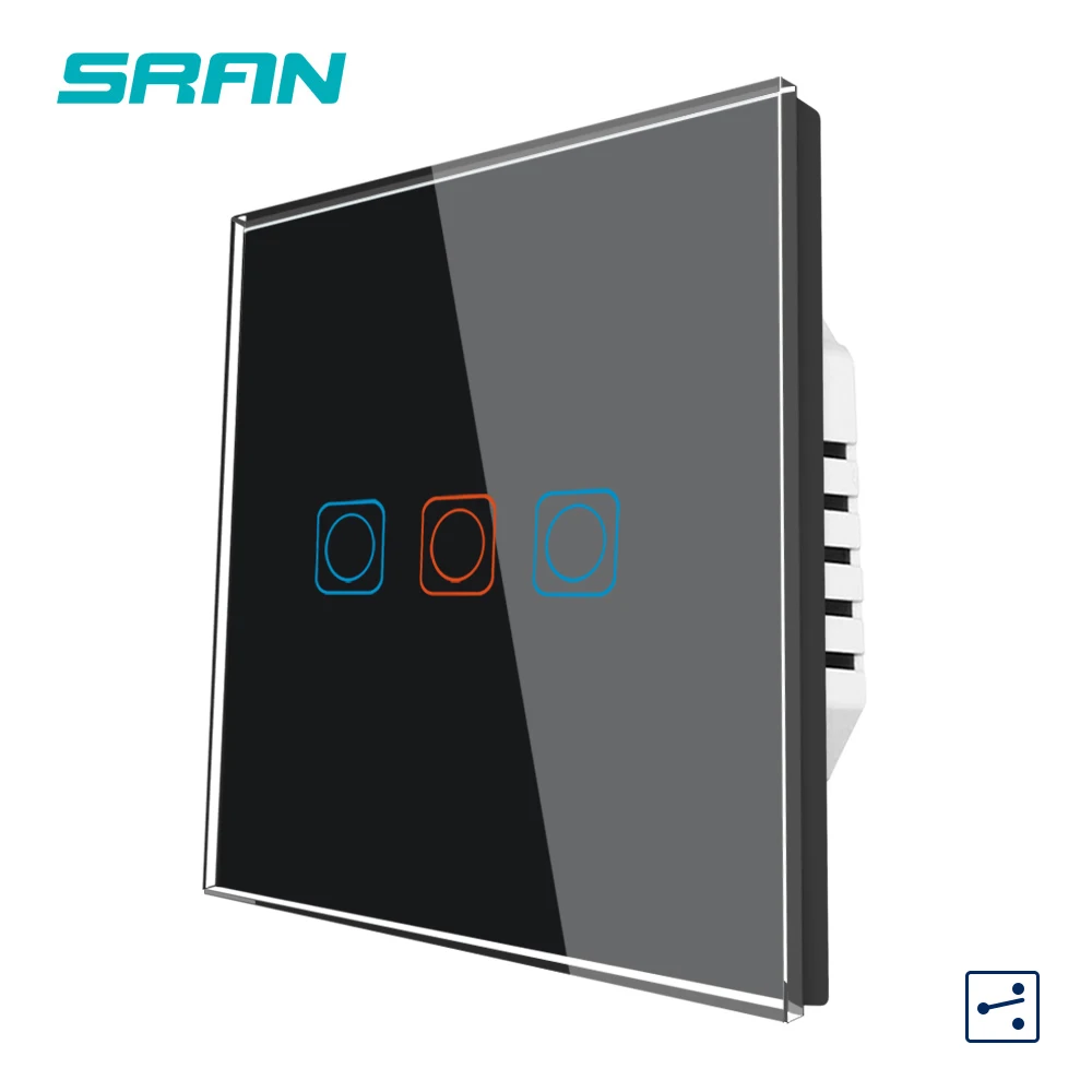 Настенный сенсорный выключатель SRAN европейского стандарта, 110-240 В, 350 Вт, черная панель из хрустального стекла со светодиодом, 3 клавиши, 2 канала, сенсорный выключатель для лестниц и прерывания