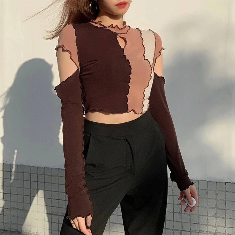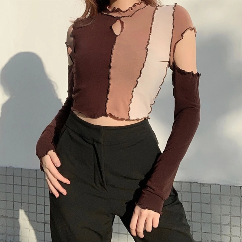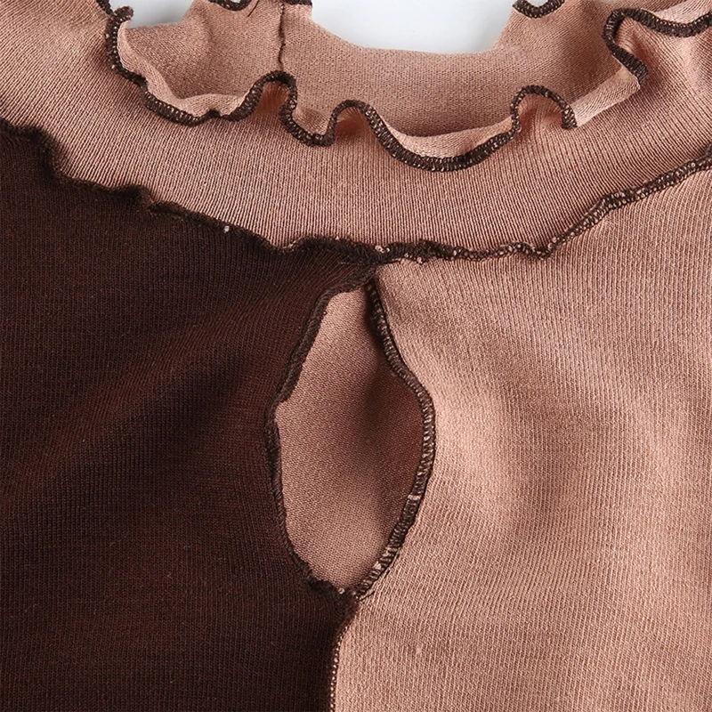 Женская обувь с резным узором с длинным рукавом Футболка с оборкой с высоким, плотно облегающим шею воротником Цвет блок лоскутный короткий топ пикантные открытые Замочная скважина Bodycon в уличном стиле