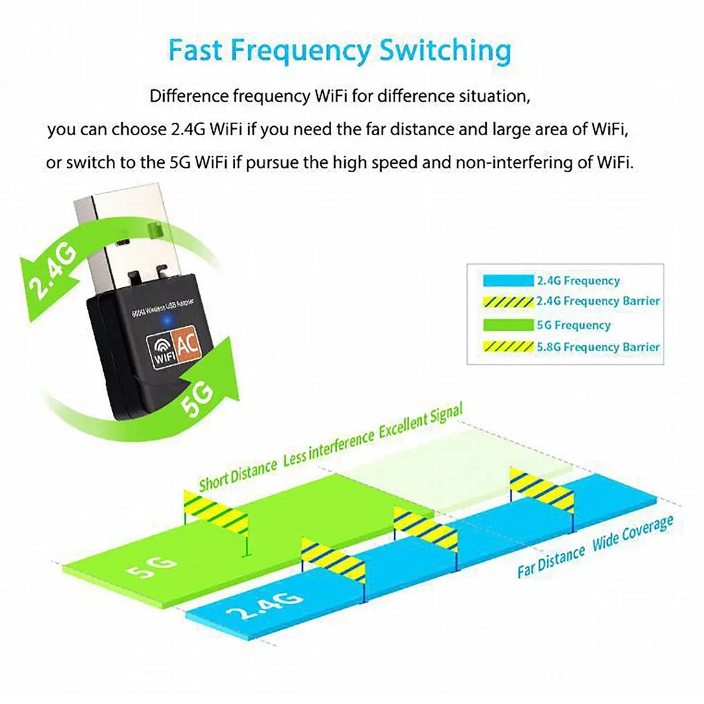 Особенности:1: два диапазона: альтернатива 11AC (5,8G) и 11N (2,4G) подключения для ТВ-шоу, hd-фильмов, потоковой передачи и онлайн-игр, чтобы избежать беспроводных помех.2:433 Мбит/с Беспроводной Скорость при температуре не выше 5,8 ГГц или 150 Мбит/с Скорость при температуре не выше 2,4 ГГц.3: может помочь вашему компьютеру создать точку доступа Wi-Fi.4: поддержка WPS(Wi-Fi защищенная настройка) метод шифрования, чтобы освободить вас от запоминания длинных паролей.5: мини и портативный дизайн для удобной переноски, удобно использовать.Описание:Изготовлен из высококачественных материалов и высокого качества.Скорость передачи составляет 600 Мбит/с.Характеристики:Название товара: двухполосный WiFi адаптерНабор микросхем: RTL8811Тип интерфейса: USB2 .0Диапазон частот: 2,4 ГГц + Wi-Fi 5 ГГцСкорость передачи данных: 600 Мбит/с (11N:150 Мбит/с, 11AC:433 Мбит/с)Стандарты: IEEE 802.11AC, 802.11b, 802,11g, 802.11nМощность RF: 20 дБм (макс.)Размер: 29*15*7 ммНапряжение: 5 в пост. Тока ± 5%Светодиодный индикатор: Link/ACTЦвет: черныйПосылка включает в себя:1 xWireless USB Wifi адаптер1 ИнструкцияПримечания:Из-за разницы между различными мониторами изображение может не отражать фактический цвет изделия. Мы гарантируем, что модель реального изделия не отличается от представленной на фото.
