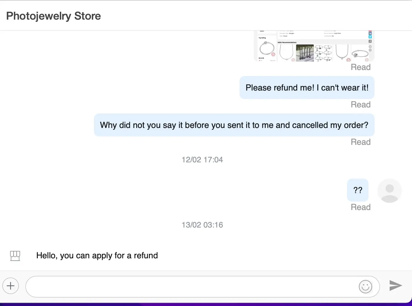Все товары от этого продавца-это не серебро 925 пробы! Продавец отправил мне это сообщение! Продавец написал мне, что он вернет мне деньги и попросит открыть спор. После того, как я это сделал, он попробовал обманить меня и не вернуть мои деньги. На спор с ним ушло две недели, но в конце концов, Aliexpress правила в мою пользу. Спасибо Aliexpress!