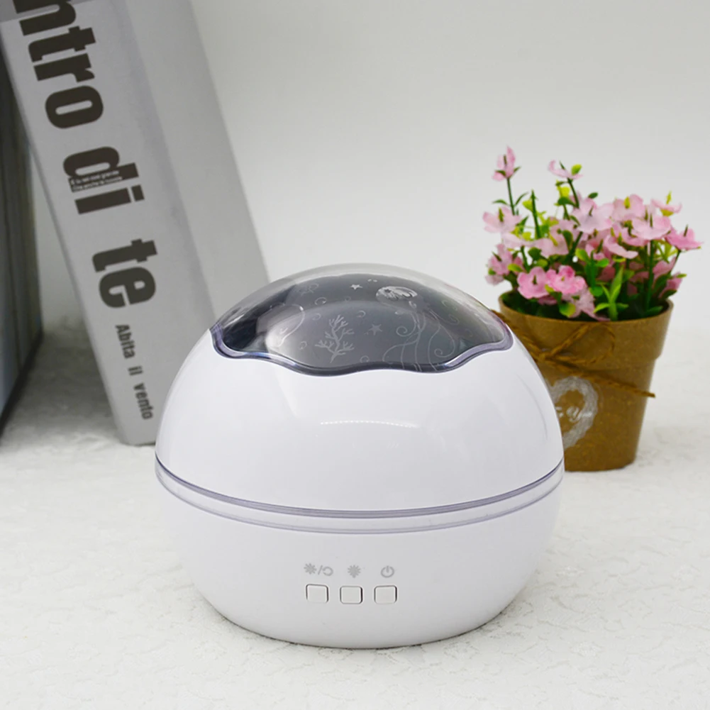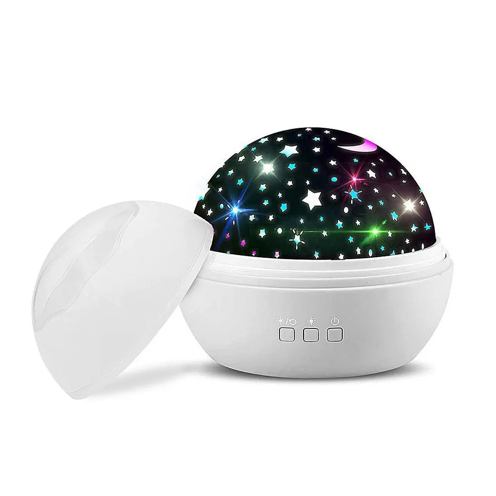 3 кнопки над выключателем питания, теплый ночной светильник/вращающийся и изменяющий цвет светильник. Нажмите кнопку поворота, проектор может вращаться на 360 °, цветная кнопка может переключаться на 8 цветовых режимов, и вы можете выбрать различные цвета для отображения.