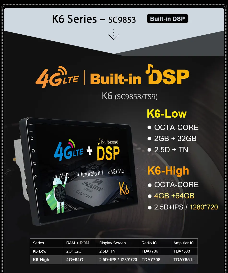 У нас есть следующие решения для удовлетворения различных требований покупателя: K6 Plus 128G --- UIS7862 | Android 10,0 | 8 ядер (A75 * 2 + A55 * 6) | 6G + 128G | 2.5D + IPS QLED 1280*720 | Радио 7708 | Усилитель 7851L K6 Plus 64G --- UIS7862 | Android 10,0 | 8 ядер (A75 * 2 + A55 * 6) | 4G + 64G | 2.5D + IPS QLED 1280*720 | Радио 7708 | Усилитель 7851L K6 Plus 32G ---- UIS7862 | Android 10,0 | 8 ядер (A75 * 2 + A55 * 6) | 3G + 32G | 2.5D + IPS QLED 1280*720 | Радио 7708 | Усилитель 7388 K3-PX5 ------ PX5 | Android 10,0 | 2G + 32GB | 2.5D + TN | Радио TEF7786 | Усилитель TDA7388| DSP K3-PX5 ------ PX5 | Android 10,0 | 4G + 64GB| 2.5D + IPS |1280*720| Радио TEF6686 | Усилитель TDA7851L| DSP K3-PX6 ------ PX6 | Android 10,0 | 4G + 64GB | 2.5D + IPS |1280*720| Радио TEF6686 | Усилитель TDA7851L| DSP|HDMI K3-PX6 ------ PX6 | Android 10,0 | 4G + 64GB | 2.5D + IPS |1280*720| Радио TEF6686 | Усилитель TDA7851L| DSP|HDMI| 8-канальный цифровой обработки сигналов K6-Low ------ SC9853 | Android 8,1 | 2G + 32GB | 2.5D + TN | Радио TDA7786 | Усилитель TDA7388| DSP|SPDIF K6-High ------ SC9853 | Android 8,1 | 4G + 64GB | 2.5D + IPS |1280*720| Радио TDA7708 | Усилитель TDA7851L| DSP|SPDIF K5-Low ------ T7 | Android 7,1 | 2G + 16GB | 2.5D + TN | 1024*600 | Радио TDA7786 | Усилитель TDA7388| DSP|SPDIF K5-High ------ T7 | Android 7,1 | 2G + 32GB | 2.5D + IPS | 1024*600 | Радио TEF7708 | Усилитель TDA7851L| DSP| SPDIF K1-Low ------ AC8227L | Android 6,0 | 1G + 16GB | 2.5D + TN | 1024*600 | Радио TDA7786 | Усилитель TDA7388 K1-High ------ AC8227L | Android 8,1 | 2G + 16GB | 2.5D + TN | 1024*600 | Радио TDA7786 | Усилитель TDA7388