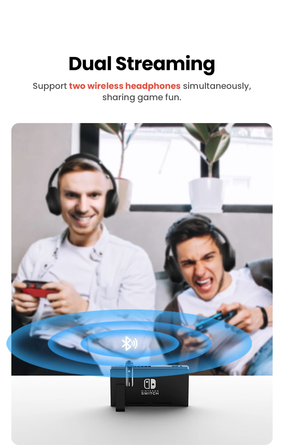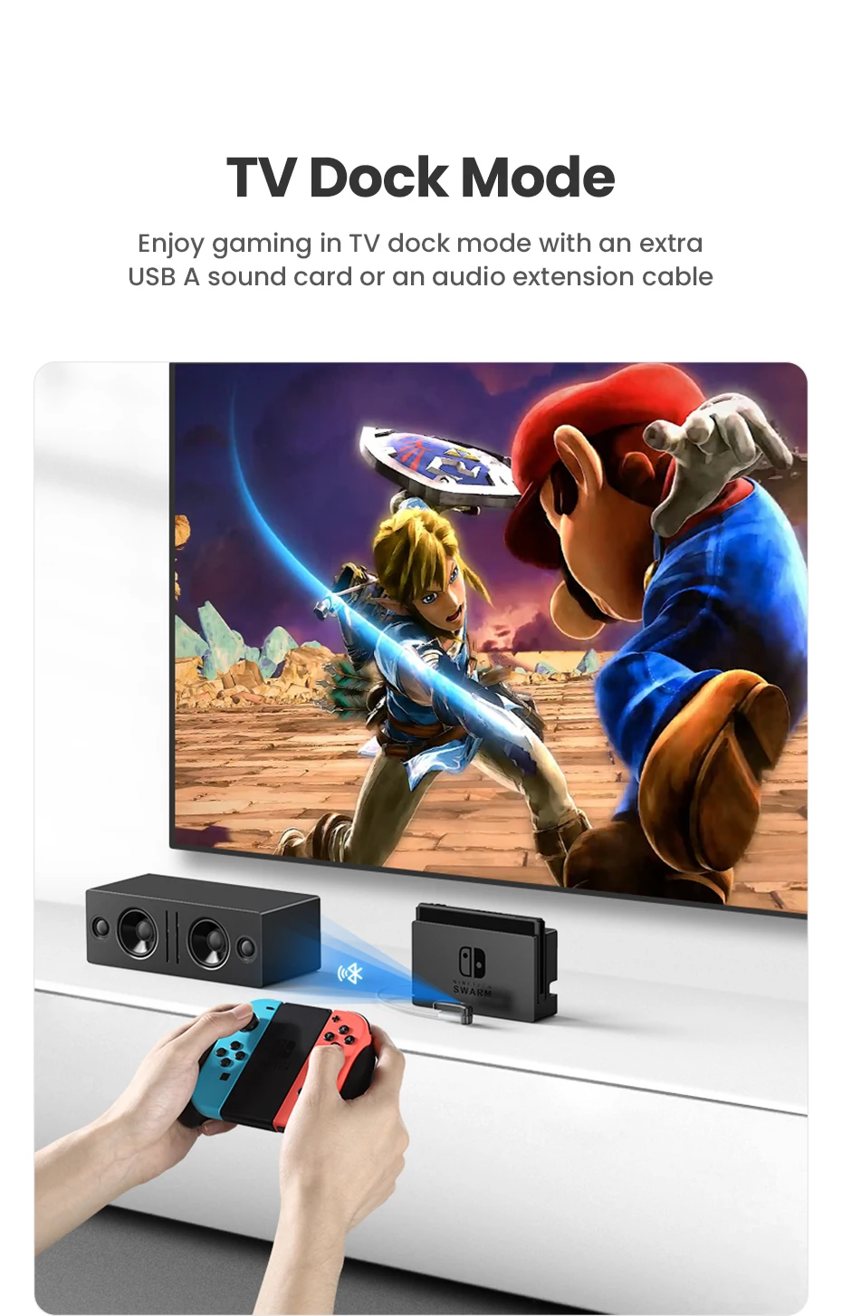Передатчик работает очень хорошо во время игры. Задержка даже не заметна, особенно если вы используете НОВЕЙШИЕ Наушники gen bluetooth 5,0 (такие как QCY T5, которые я использую), это очень полезно для тех, у кого есть переключатель Nintendo. Если вы хотите использовать его в стыкованном режиме, вам просто нужно использовать Удлинительный кабель 3,5 мм. Таким же образом вы можете подключить его к телевизору.
