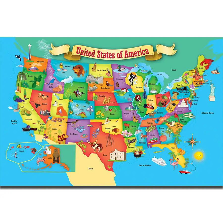 Плакаты и принты для детской комнаты, карта мира США, география для детей, обучение, Школьное искусство, холст, живопись, спальня, общежитие, домашний декор
