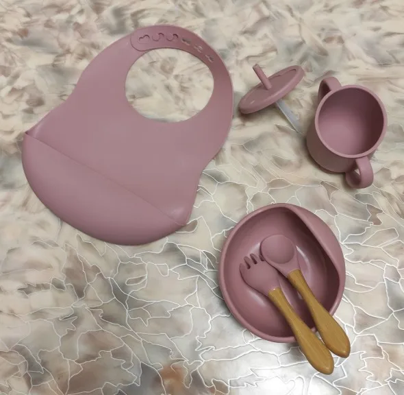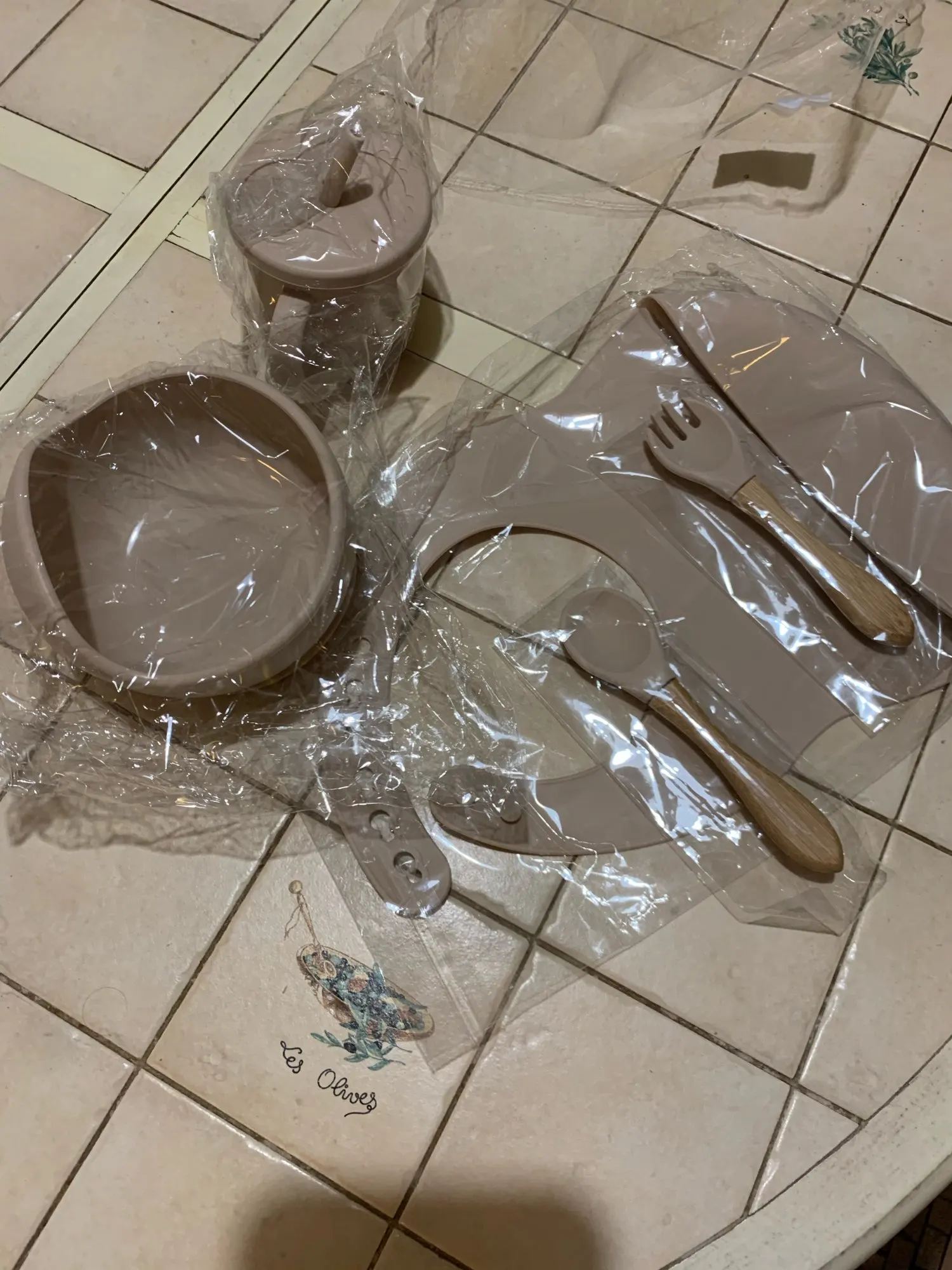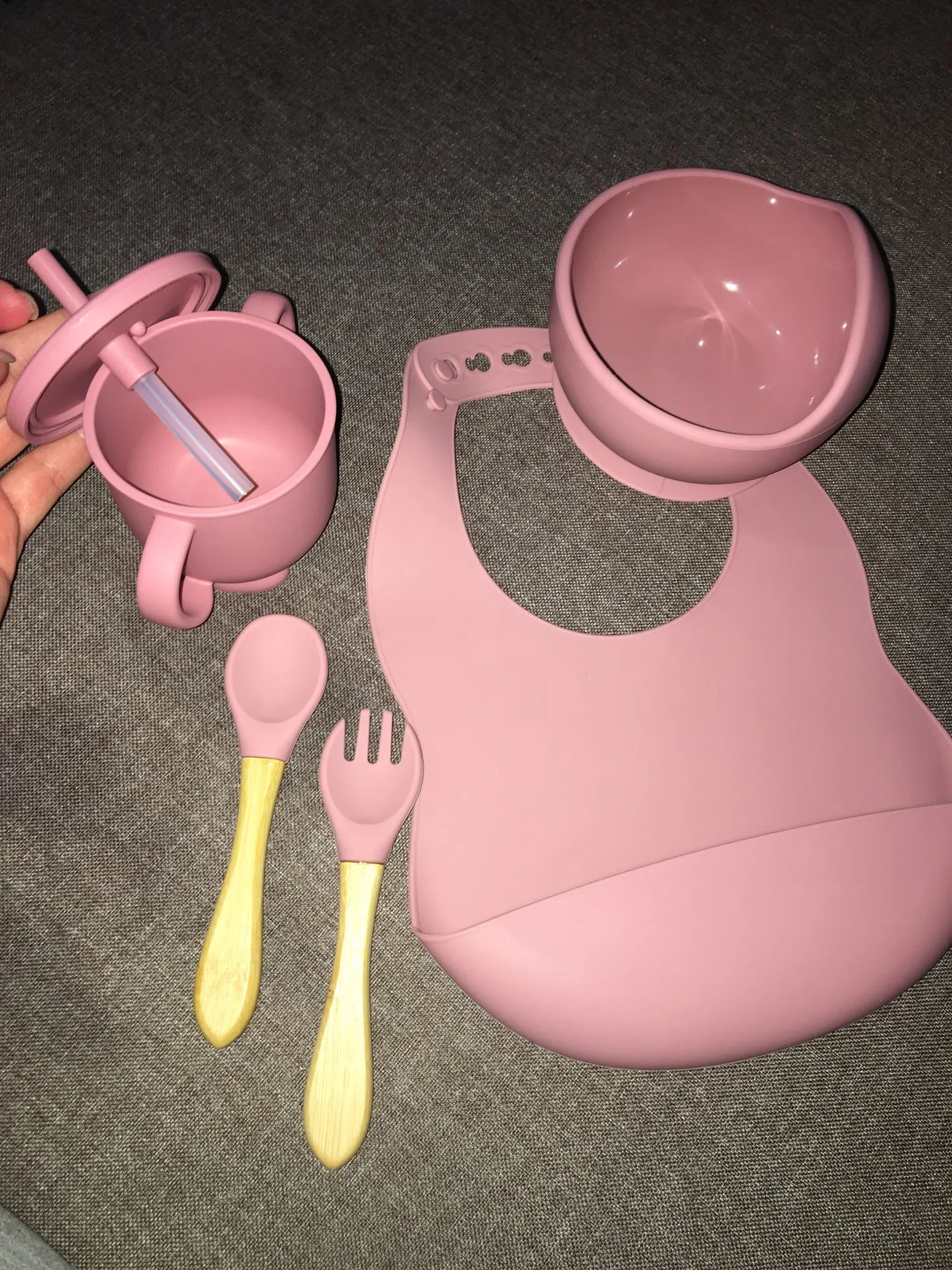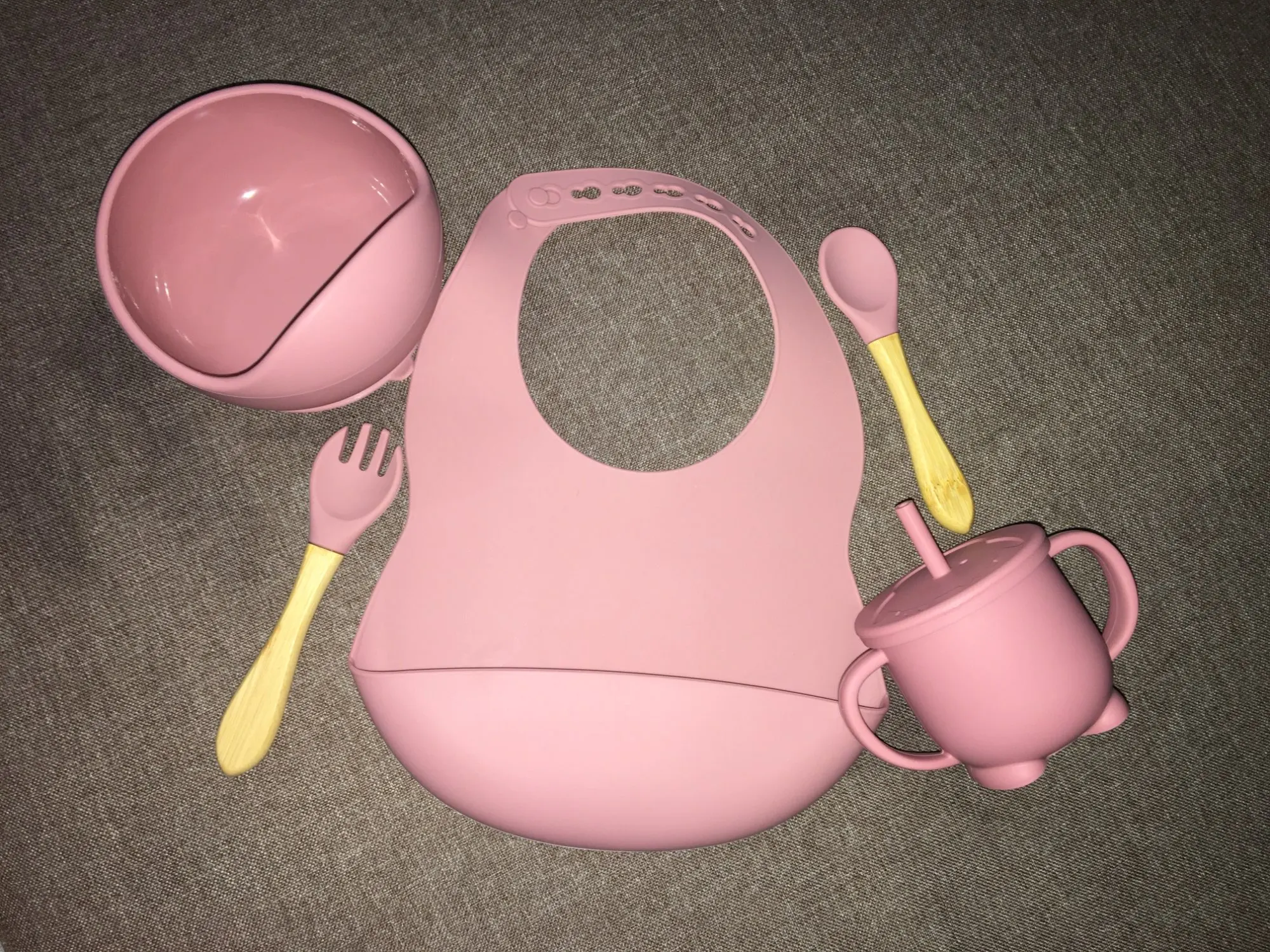 Набор пришёл быстро, целый, хорошо упакован. Не приятный запах был только у вилки. Сначала мне не понравилось качество поильника, но когда я закрыла крышку, обрадовалась. Вода не вытекает, даже если поильник падает или дочка вертит им. Ложка немного толстовата и по началу не удобно кормить ей, но я быстро привыкла. Нагрудник отличный! Тарелочка очень хорошо присасывается к столу, в отличии от поильника. Заказом довольна!