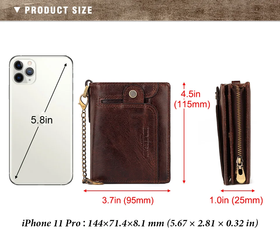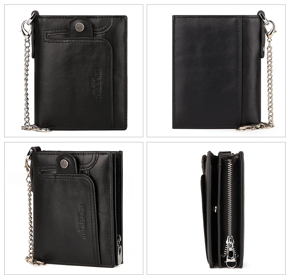 Кошелек KAVIS мужской из натуральной кожи с гравировкой, маленький бумажник с монетницей, кредитница с цепочкой, портмоне с кармашком на молнии