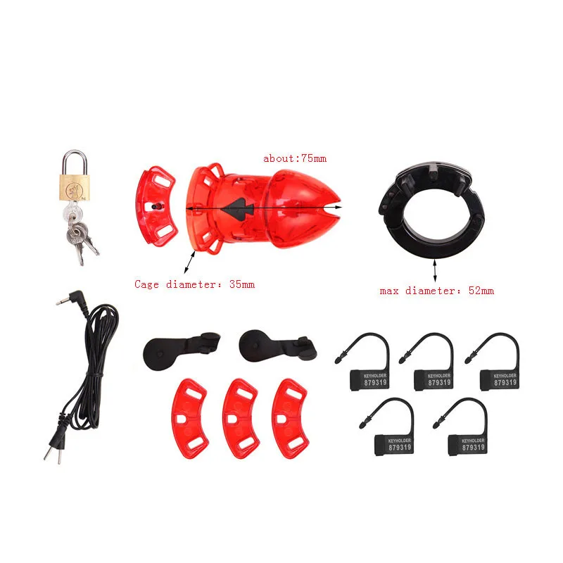 Estim Мужской целомудрие клетка электро стимуляция набор Упаковочный лист: Красный прозрачный черный эти три характеристики: 1 электростимовая клетка; Ее длина составляет около 75 мм, а внутренний диаметр клетки-около 35 мм. 1 базовое кольцо, похожее на наручники, которое можно отрегулировать до наиболее подходящего размера, с максимальным регулируемым внутренним диаметром 5,25 см (2,07 дюйма); 3 отверстия для регулировки расстояния между клеткой и кольцом; 1 пластиковый байонетный замок, используемый для фиксации кольца в правильном положении; 1 металлический замок с двумя ключами. 5 шт одноразовый пластиковый замок 1 шт 2-в-1 штырькового шнура Другие характеристики: 1 шт. Гальваническая клетка; Длина около 75 мм, внутренний диаметр клетки около 35 мм. 1 шт. базовое кольцо, которое похоже на наручники, вы можете настроить на наиболее подходящий размер, максимальный регулируемый внутренний диаметр составляет 5,25 см (2,07 дюйма); 3 шт Spencers, который помогает регулировать расстояние клетки и кольца; 1 шт. пластиковый байонетный замок, который используется для фиксации кольца в подходящем положении; 1 шт. металлический замок с двумя ключами. 5 шт одноразовые пластиковые замки 1 шт. 2-в-1 штырькового шнура 1 блок питания (2 шт. AAA батареи или 3 шт. AAA батареи, батарея не входит в комплект)