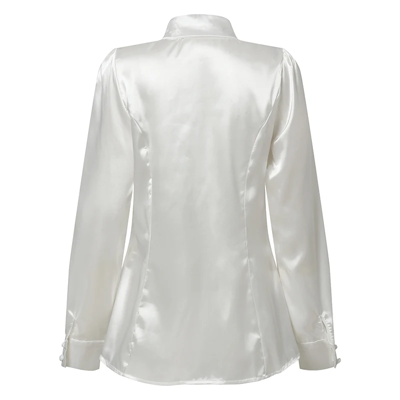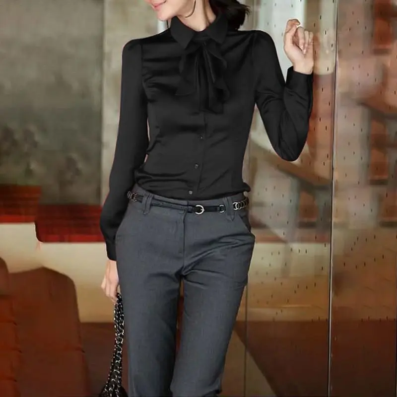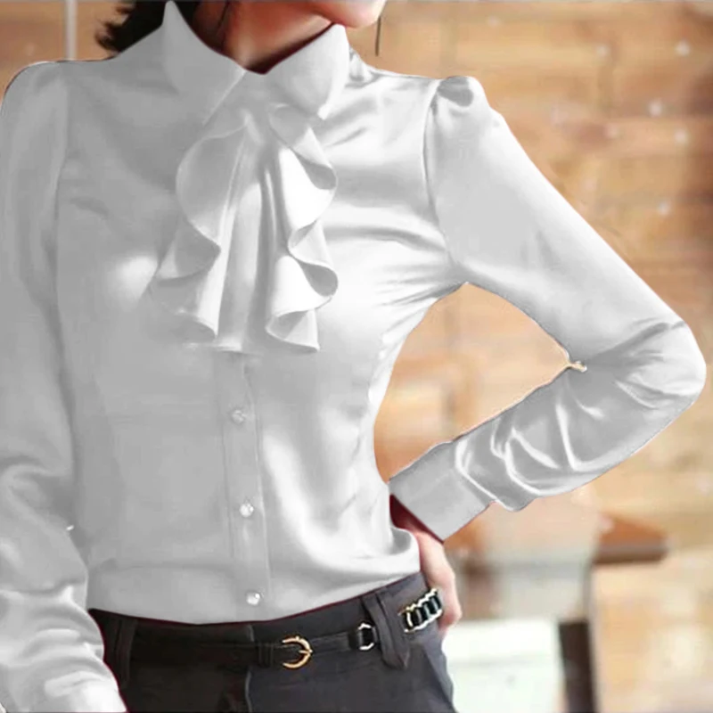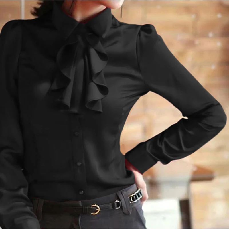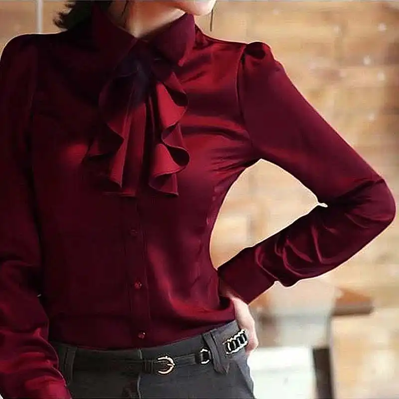 Блузка Женская атласная с длинным рукавом, модный топ, элегантная рубашка с оборками, на пуговицах, для работы и вечеринок, однотонная, осень 2021