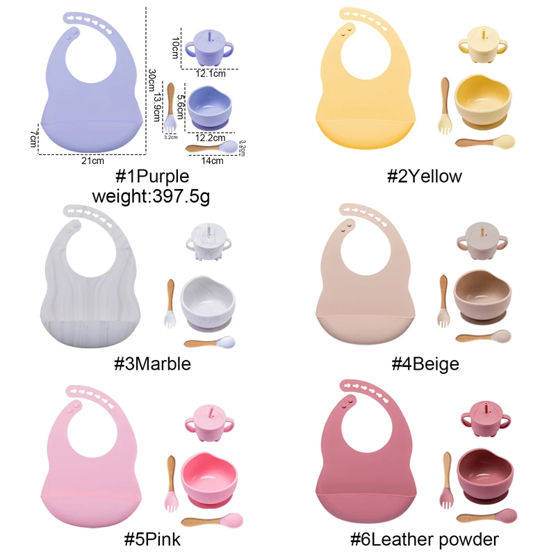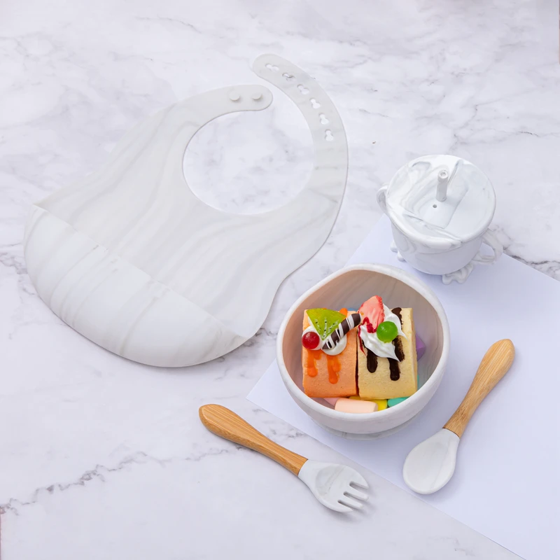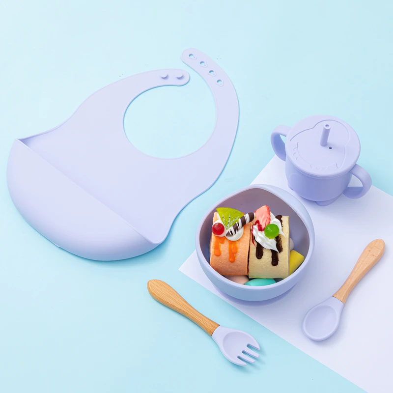 Набор силиконовых тарелок для кормления младенцев, комплект из 5 нескользящих чашек с деревянной вилкой и ложкой, с присоской, для обучения детей