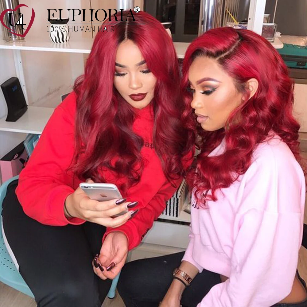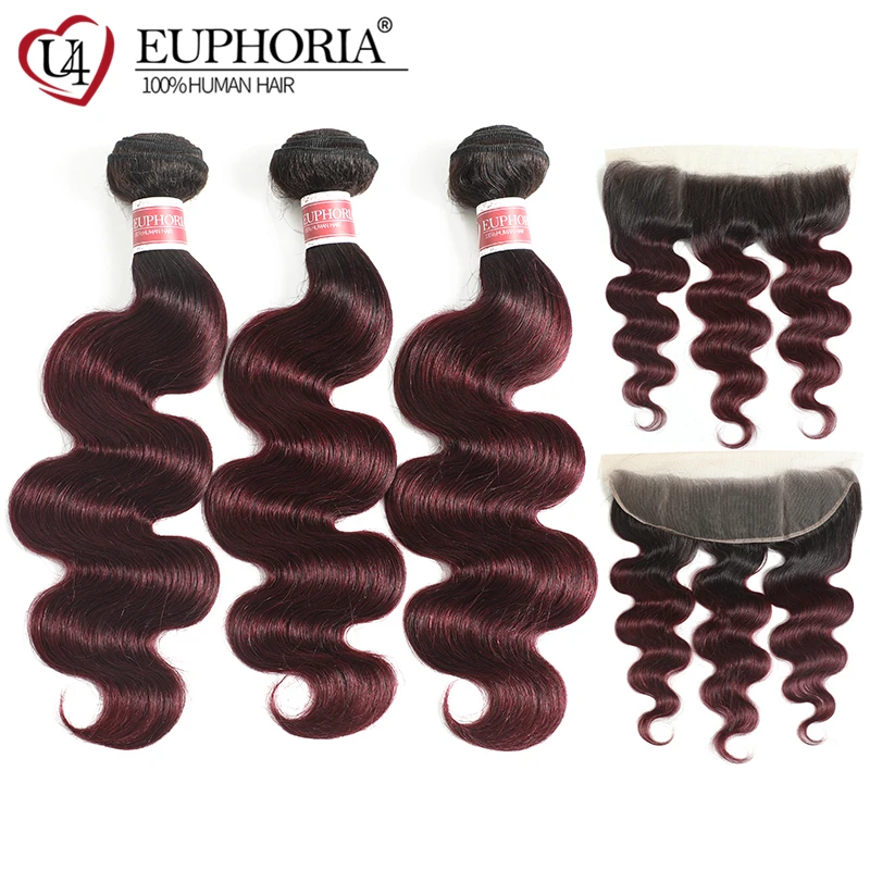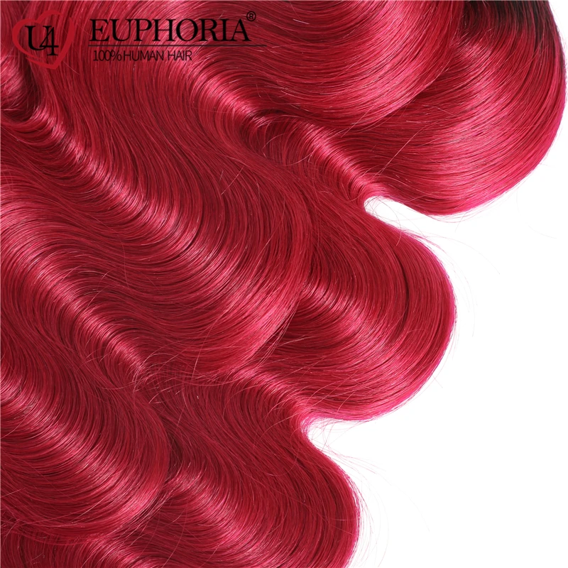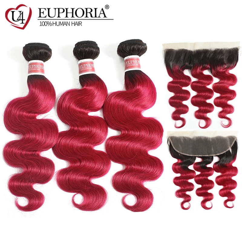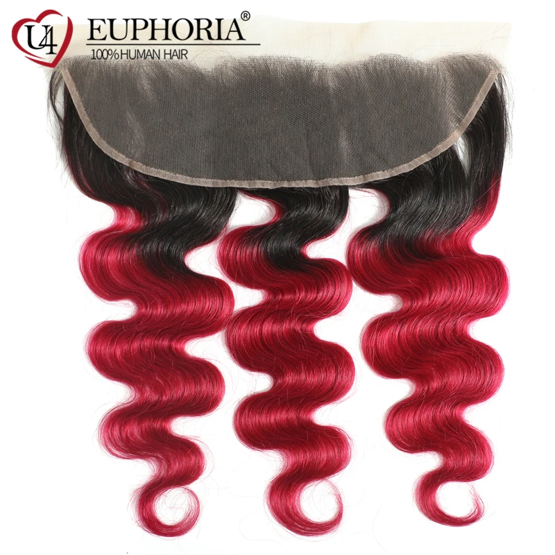 Омбре красный Бург 3 пучка с фронтальной волной тела пучки с 13x4 закрытие шнурка фронтальные бразильские Remy человеческие волосы ткачество EUPHORI