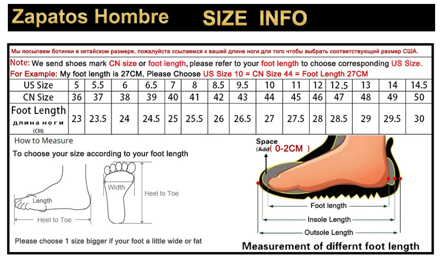 Важное примечание:Длина стопы не соответствует длине стельки.Длина стопы не соответствует длине подошвы.Длина стопы <длина стельки <длина подошвы1. Пожалуйста, выберите размер в соответствии с длиной стопы (Не выбирайте размер в соответствии с обычным размером вашей страны!)Например: если вы измеряете каблук до носка 27 см, пожалуйста, выберите размер 44 = американский размер 102. Наша обувь отмечена китайским размером обуви или соответствующей длине стопы.3. Размер CN 44(27 см). Эта длина стельки 27 см не соответствует длине подошвы, это означает только длину стопы.4. Из-за различных настроек дисплея и угла съемки цвет может немного отличаться от реального.*** Если у вас есть какие-либо вопросы, пожалуйста, свяжитесь со мной. ****** Таблица размеров ***Европейский размер 38 = US6 = длина стопы 24,0 смЕС Size39 = US6.5 = стопы Длина 24,5 смЕвропейский размер 40 = US7 = длина стопы 25,0 смЕС Size41 = US8 = стопы Длина 25,5 смЕвропейский размер 42 = US8.5 = длина стопы 26,0 смЕвропейский размер 43 = US9.5 = длина стопы 26,5 смЕвропейский размер 44 = US10 = длина стопы 27,0 смЕС Size45 = US11 = стопы Длина 27,5 смЕвропейский размер E46 = US12 = длина стопы 28,0 смЕвропейский размер 47 = US12.5 = длина стопы 28,5 см
