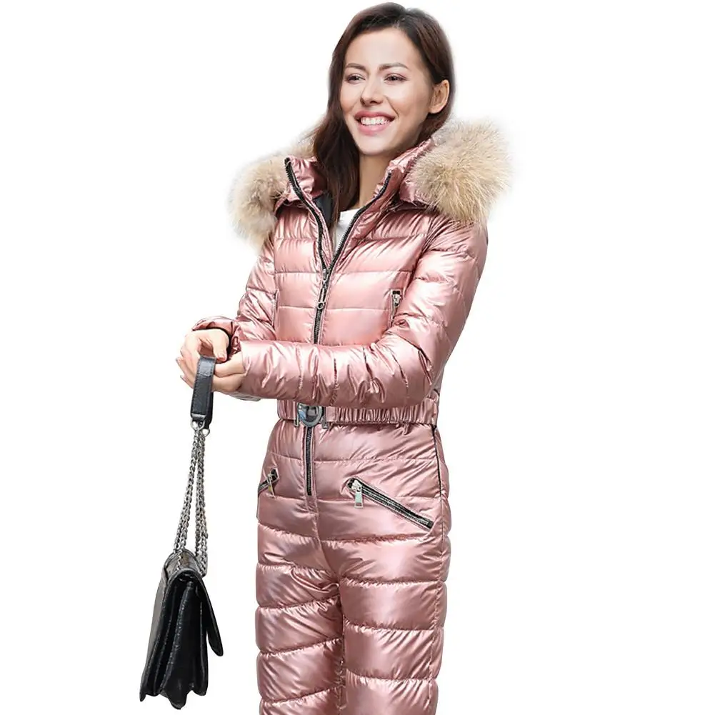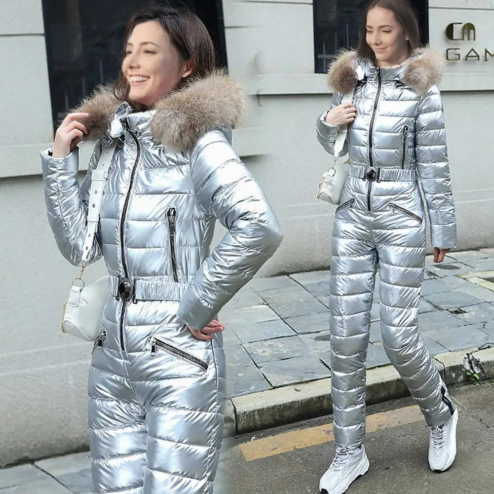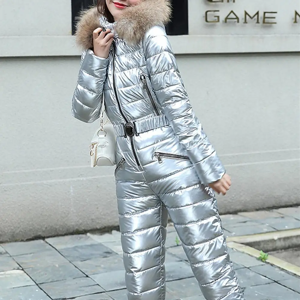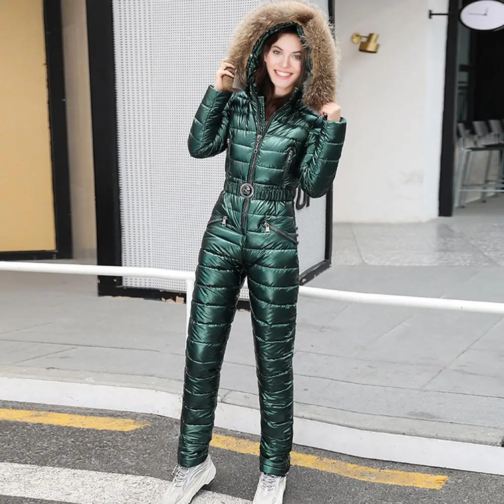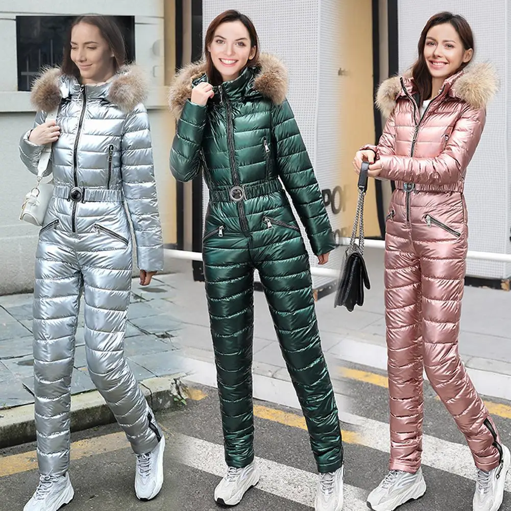 Зимние теплые женские спортивные костюмы с капюшоном, повседневные Комбинезоны, парка с подкладкой, теплый лыжный костюм с поясом, прямой цельный женский спортивный костюм на молнии