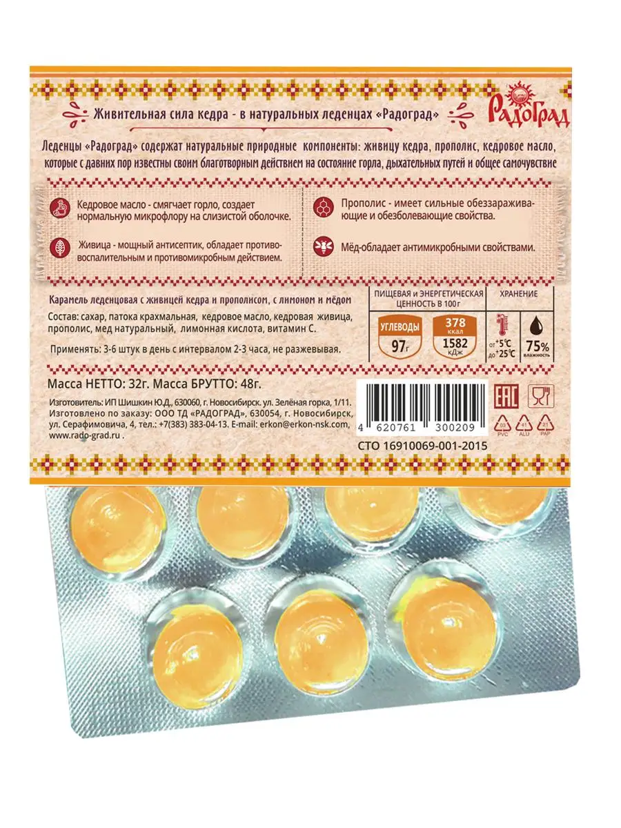 Леденцы живичные "Радоград", с прополисом (лимон и мёд на сахаре), блистер 10 шт. * 15 уп.