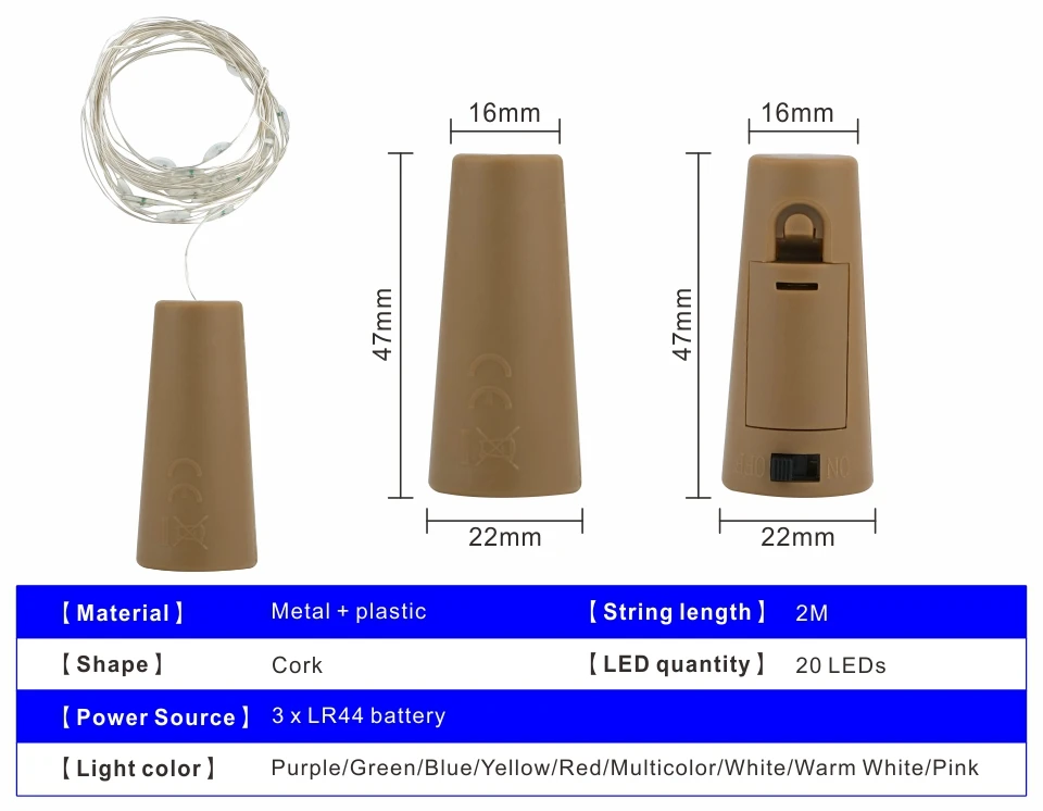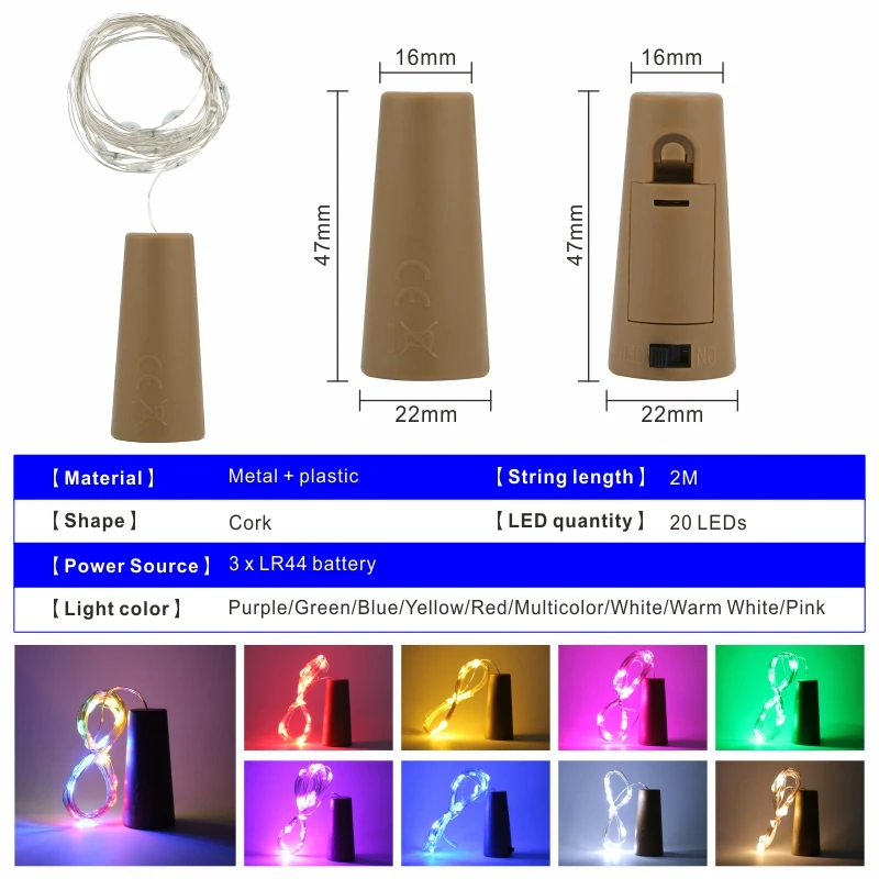 Каждый пробковый светильник для винных бутылок питается от 3 батареек LR44, не требуется розетка питания и удобен в использовании.