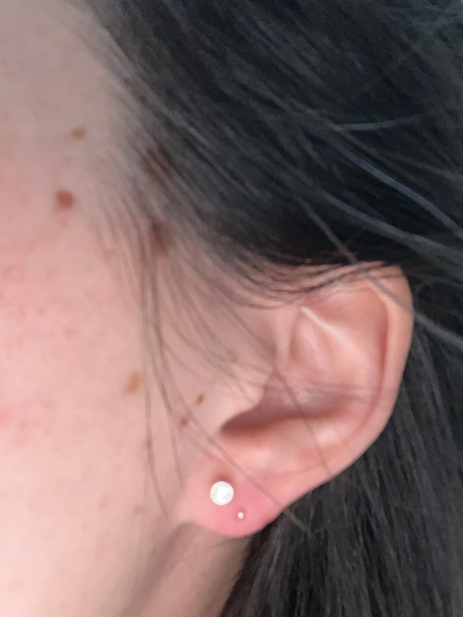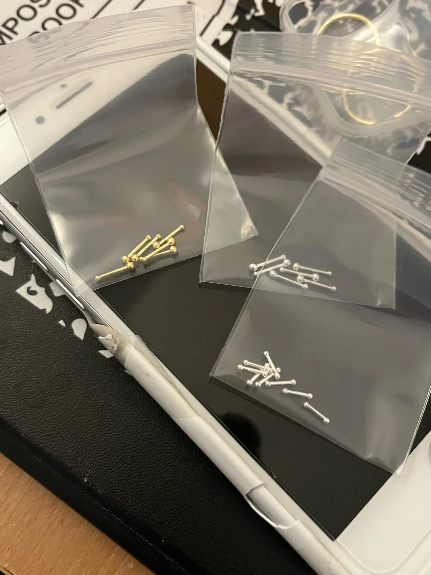 Они действительно маленькие, я хотел их по этой причине, но в конце концов я не могу их надеть, потому что они выходят. Даже если я надену пластиковые колпачки (как обычные серьги), они выходят сзади. Важно: они не откручиваются, это планка, и сферические части должны пройти через отверстия в ухе, это стоило мне, и это немного болит.