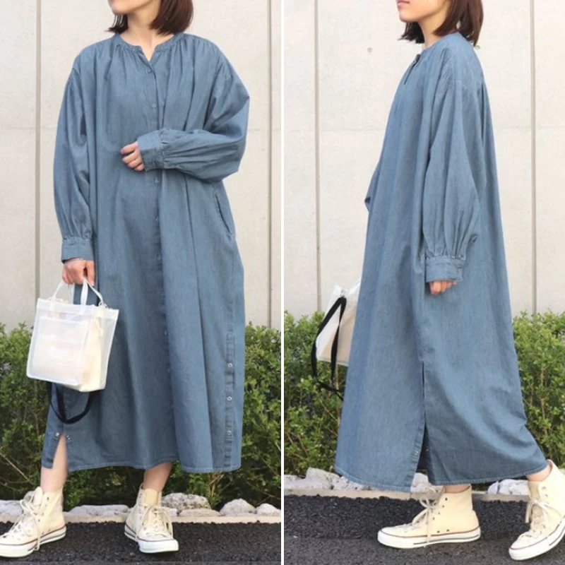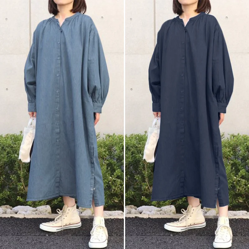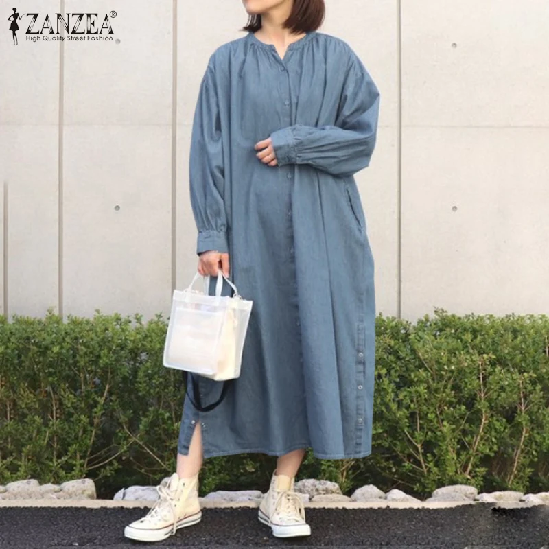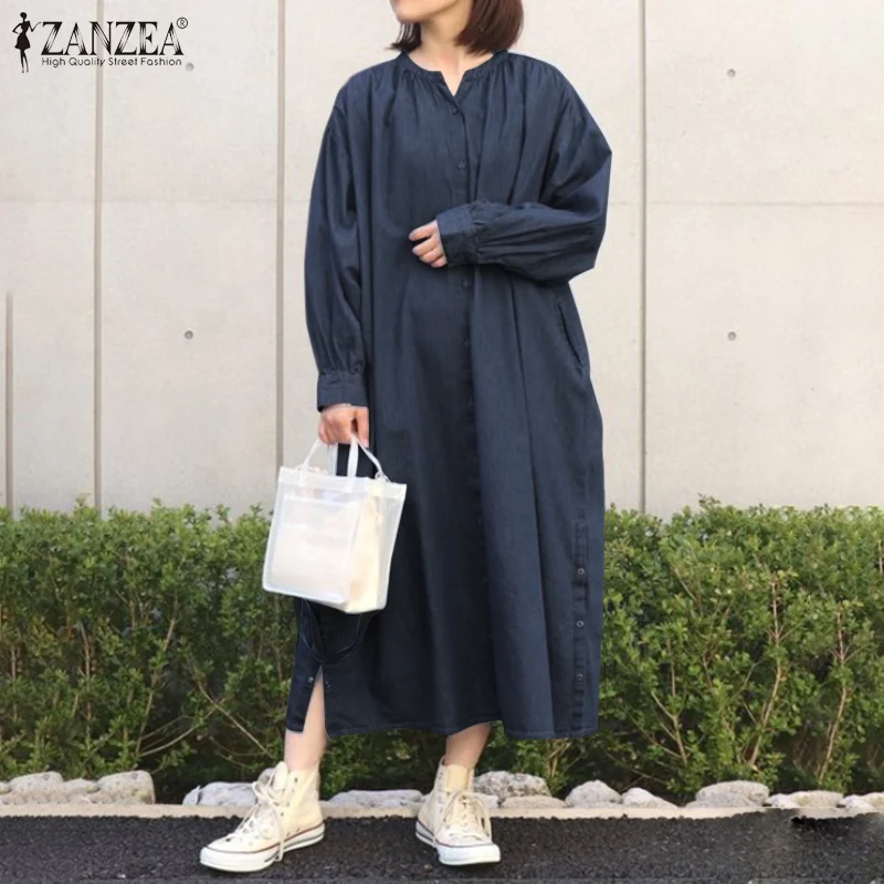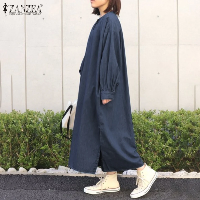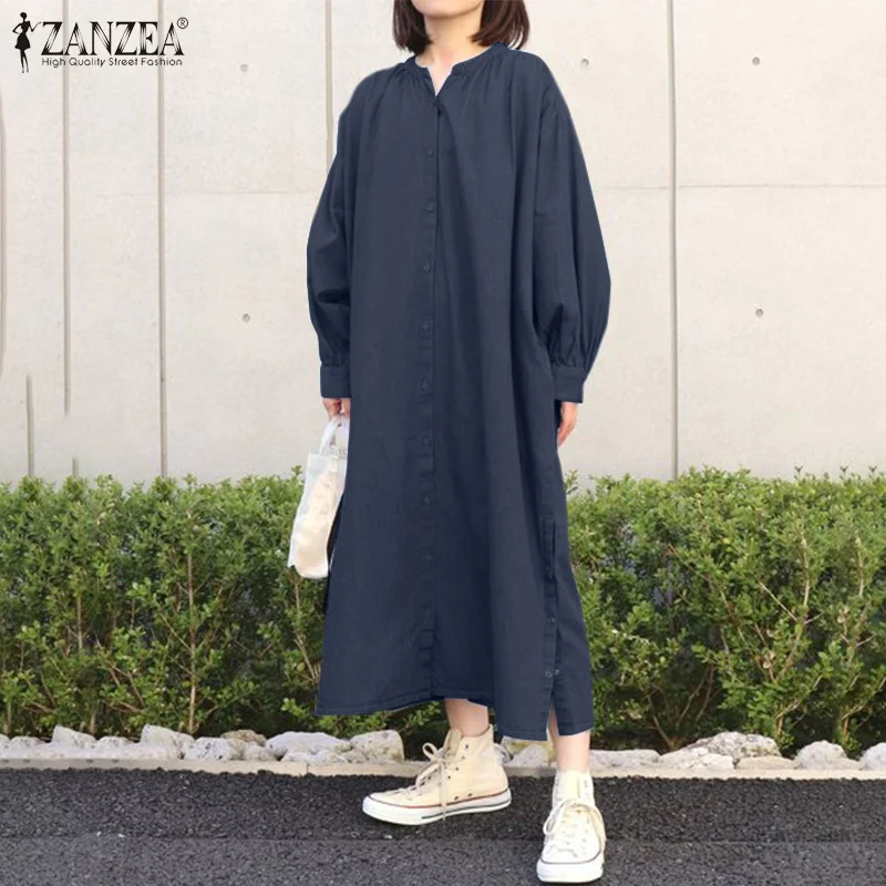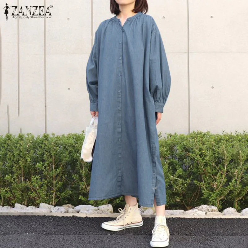 Платье ZANZEA женское джинсовое с пышными рукавами, модный Повседневный Сарафан-рубашка на пуговицах, с разрезом, в стиле оверсайз, голубое, весна