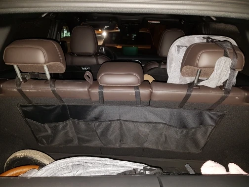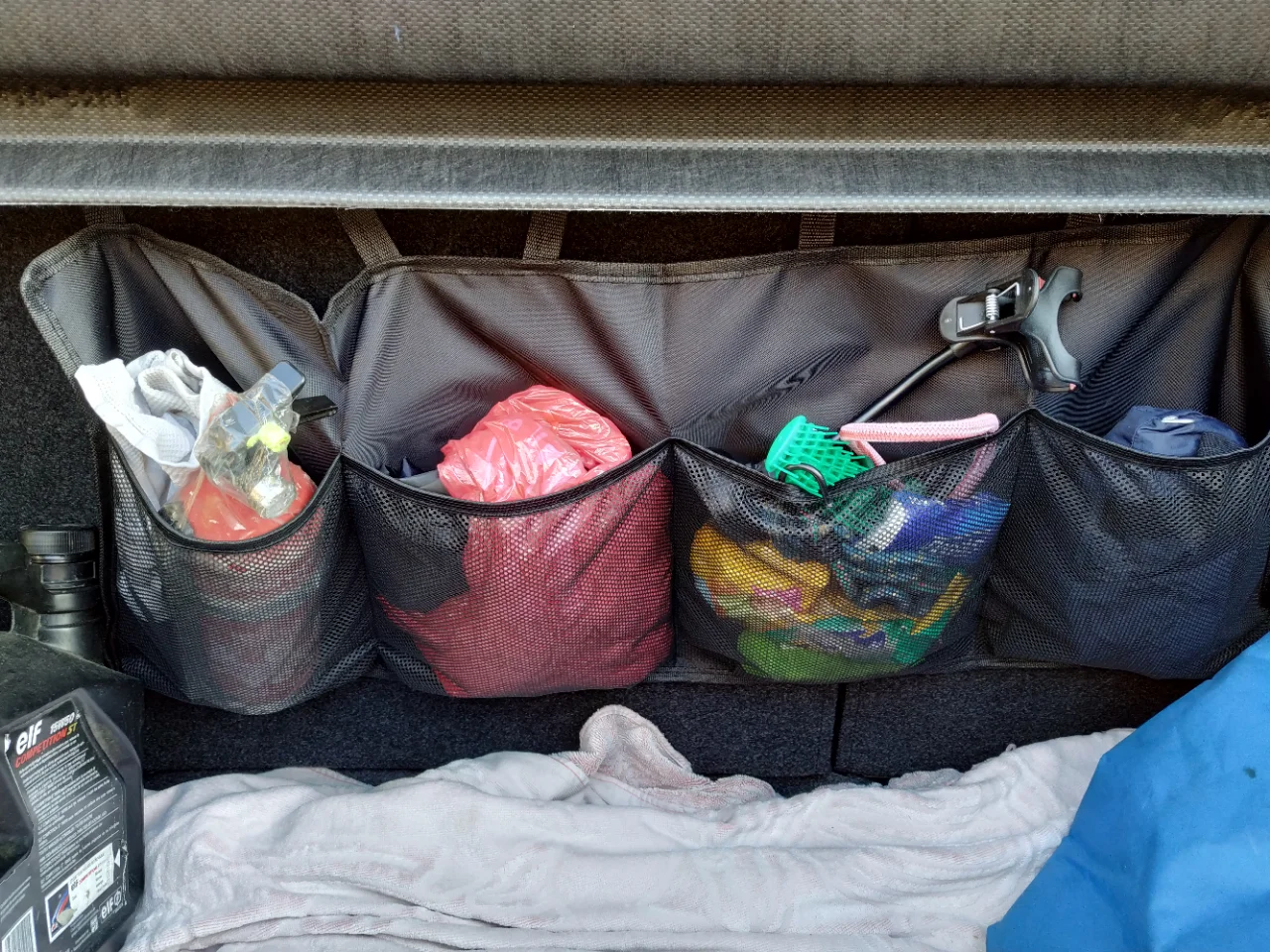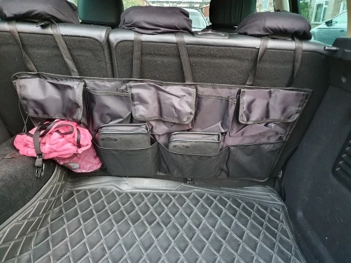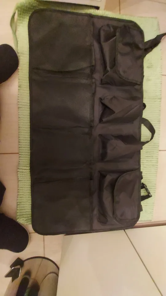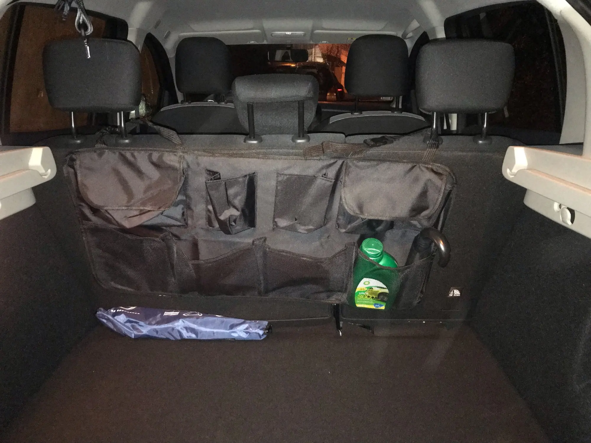 Органайзер хорошего качества в багажнике к заднему сидению, прицепляется с помощью 3 петель с клипсами и по бортику органайзера имеется лепучка так что все надёжно. На мою машину село хорошо Toyota Auris 2013, но не совсем удобно так далеко тянутся но это из за строения багажника . Продавцу спасибо.