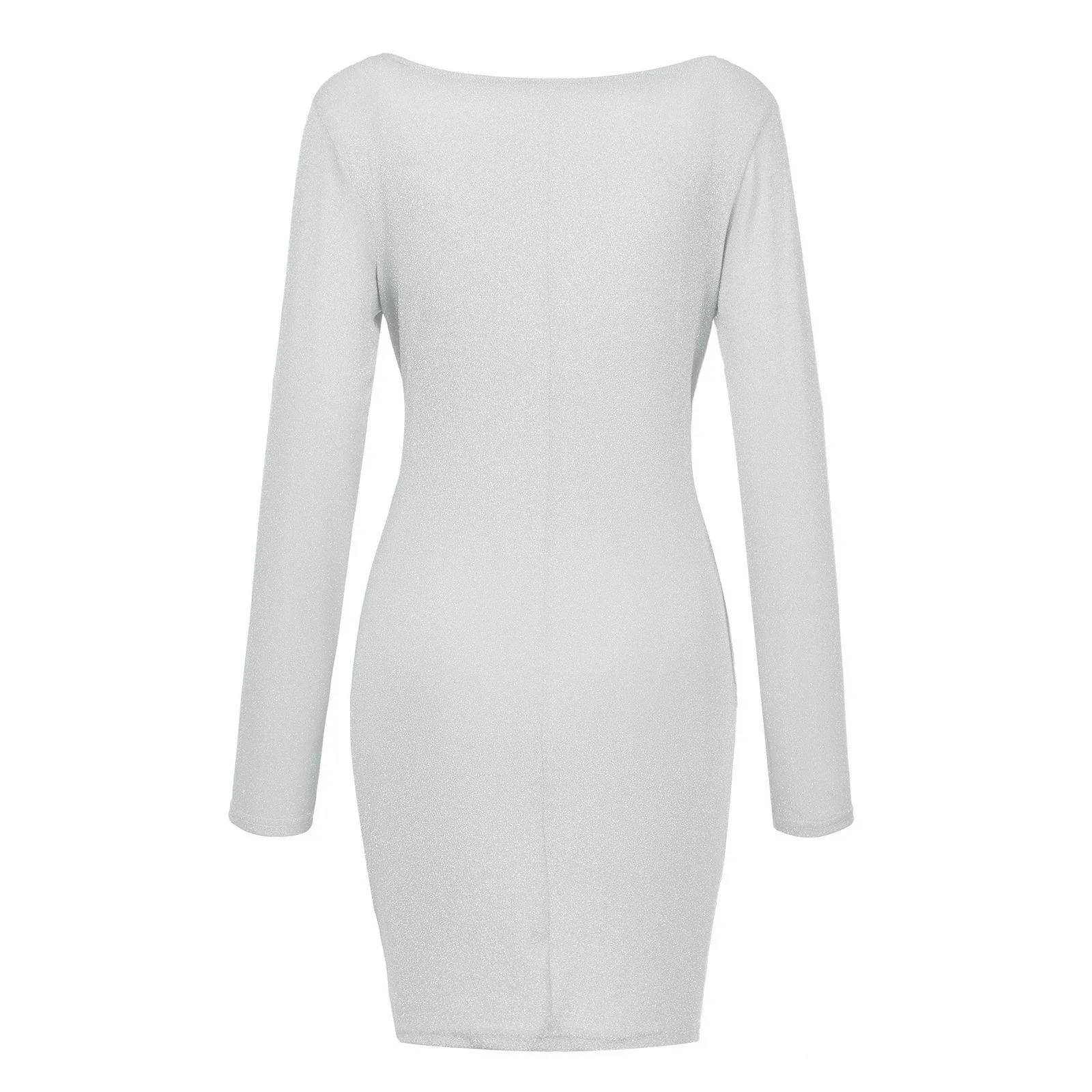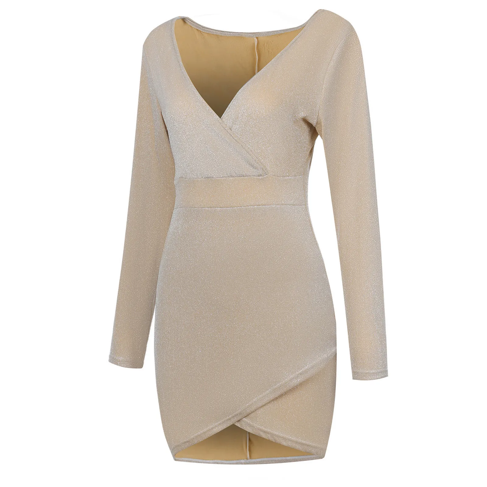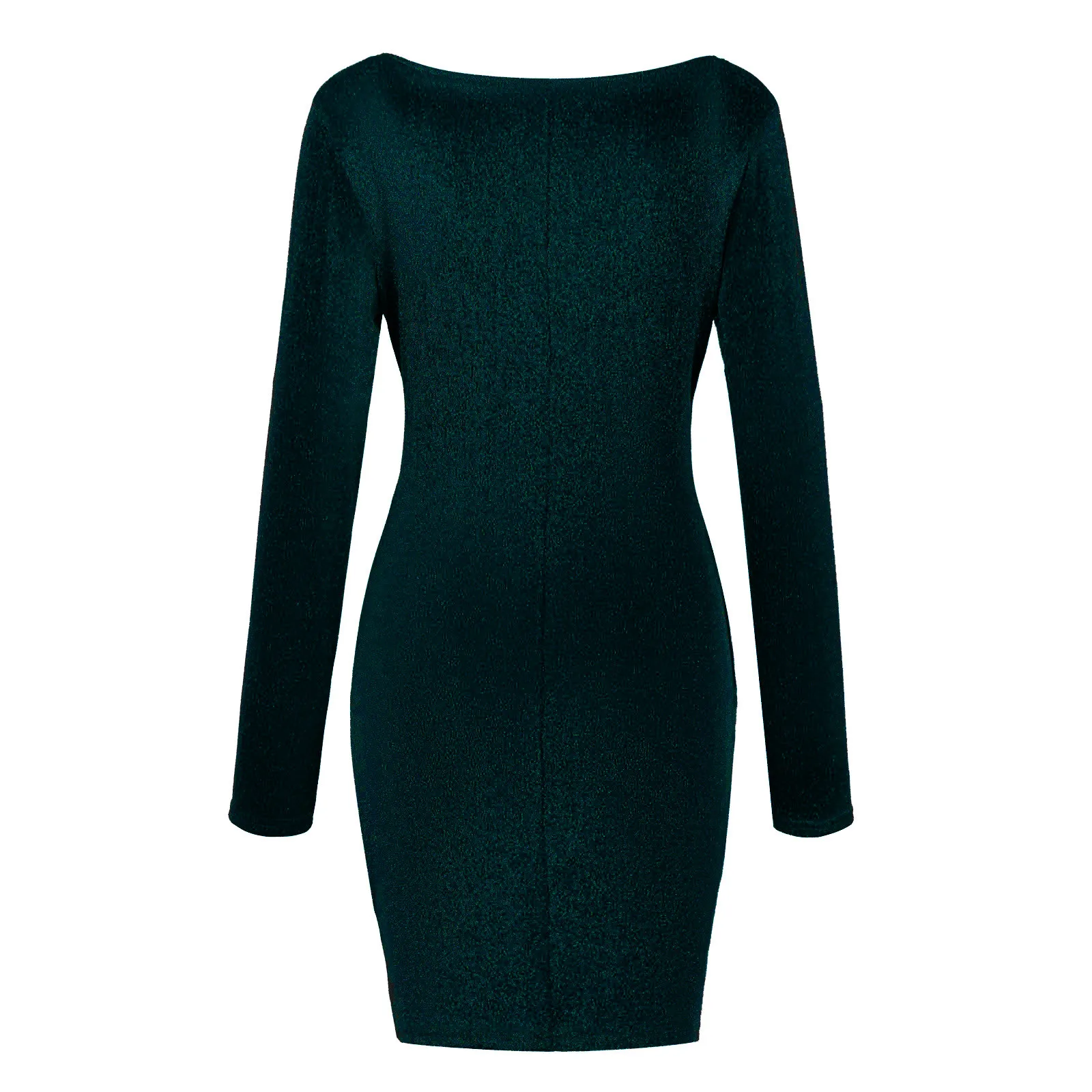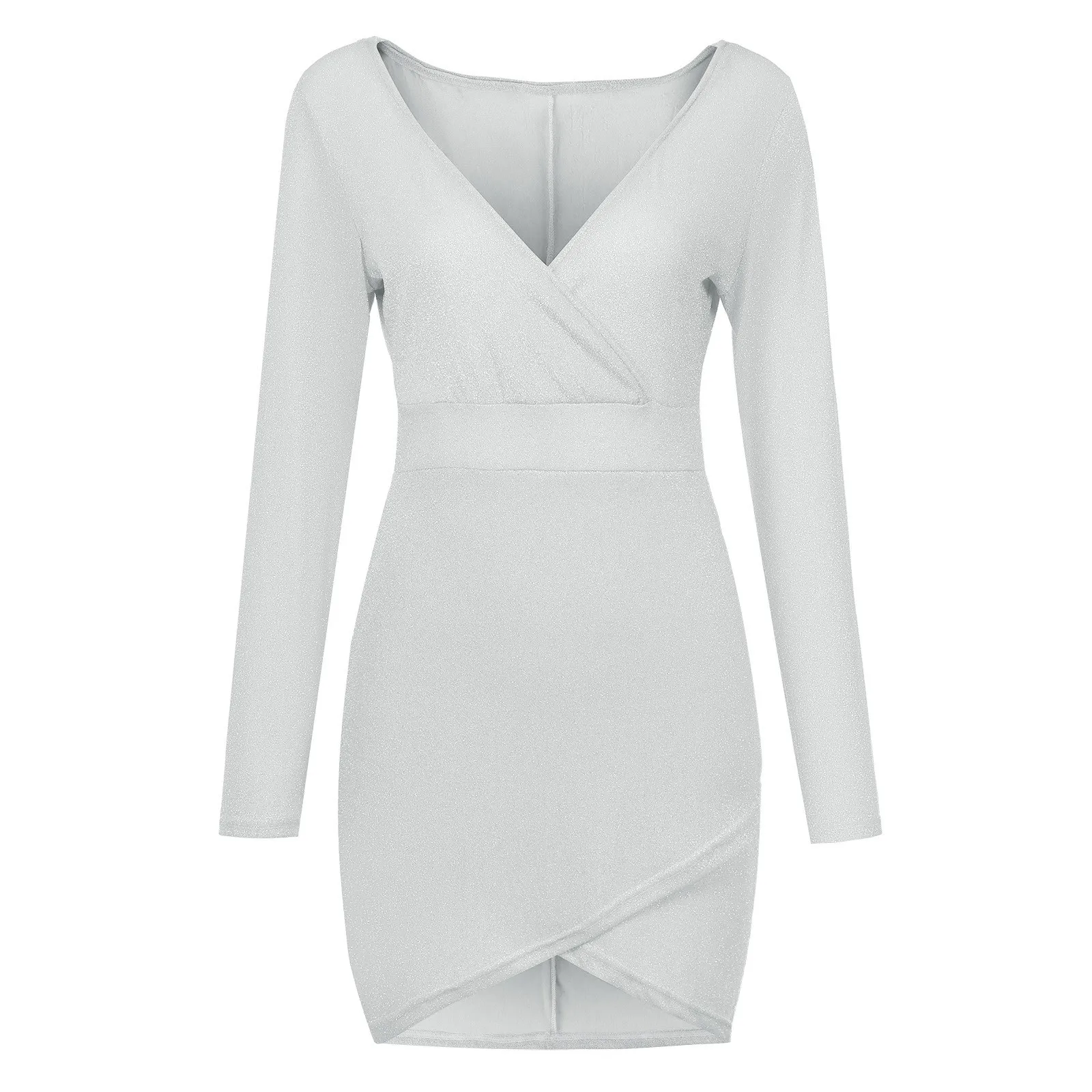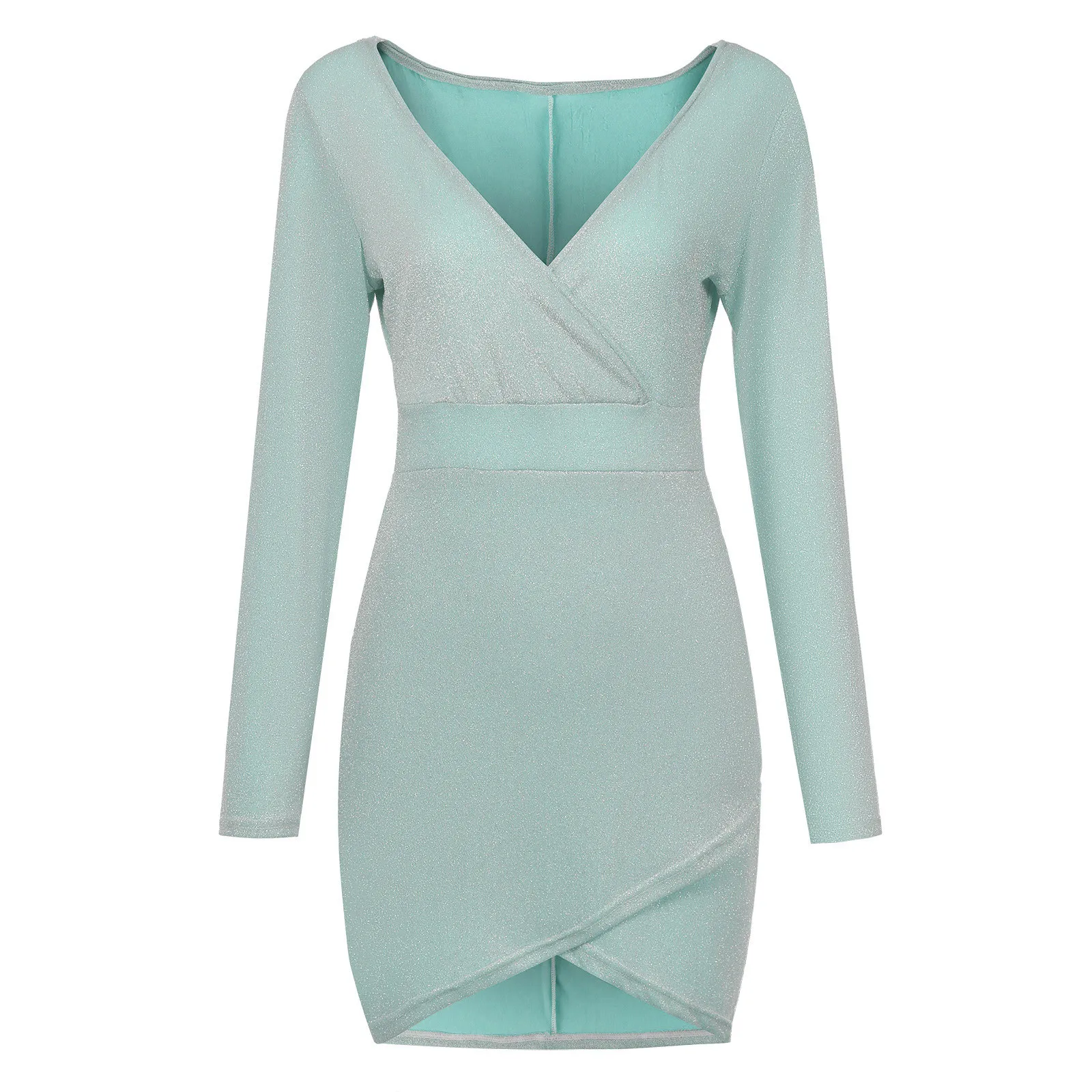 Женское платье, модное однотонное вечернее мини-платье с V-образным вырезом и блестками, с длинным рукавом