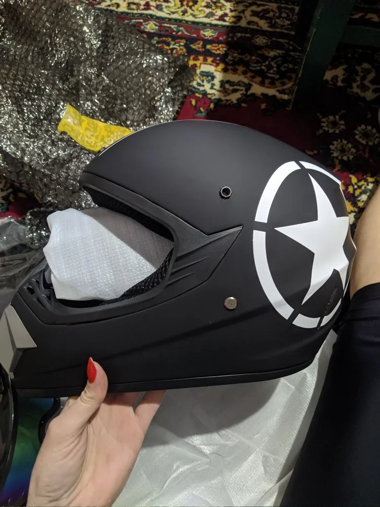 Шлем красивый,но пластик дешёвый,колкий при падении разлетится на куски. Курьер доставил до дома,ждал три недели ,но пришёл треснутый в нескольких местах ,открыл спор предостави фотографии и али за один день решил вернуть 50%стоимости товара меня устроило ...