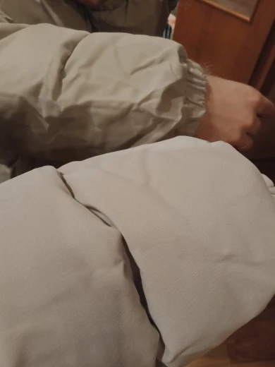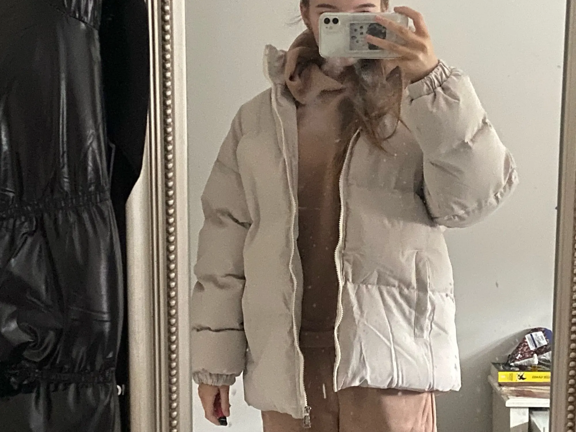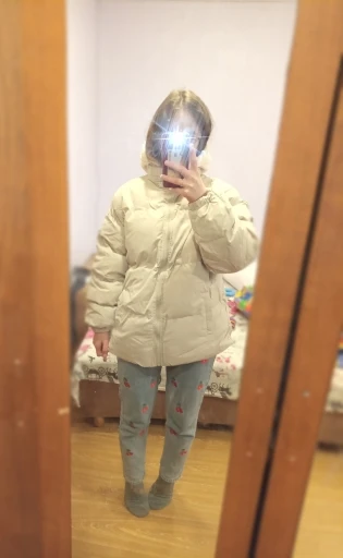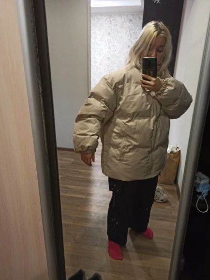 На рост 158 размер М смотрится, как отличный оверсайз, как и хотела, очень удобно, под низ влезет даже толстый свитер и кардиган. По ощущениям куртка до -10 будет хорошо греть, если с термобельем,то вообще прекрасно, может будет комфортно даже в -15. Цвет как на фото, топленного молока, материал приятный и не блестит, выглядит стильно. Есть торчащие нитки по молнии и местами не очень хорошо набито наполнителем, но не критично, за свои деньги куртка очень хороша, покупкой довольна