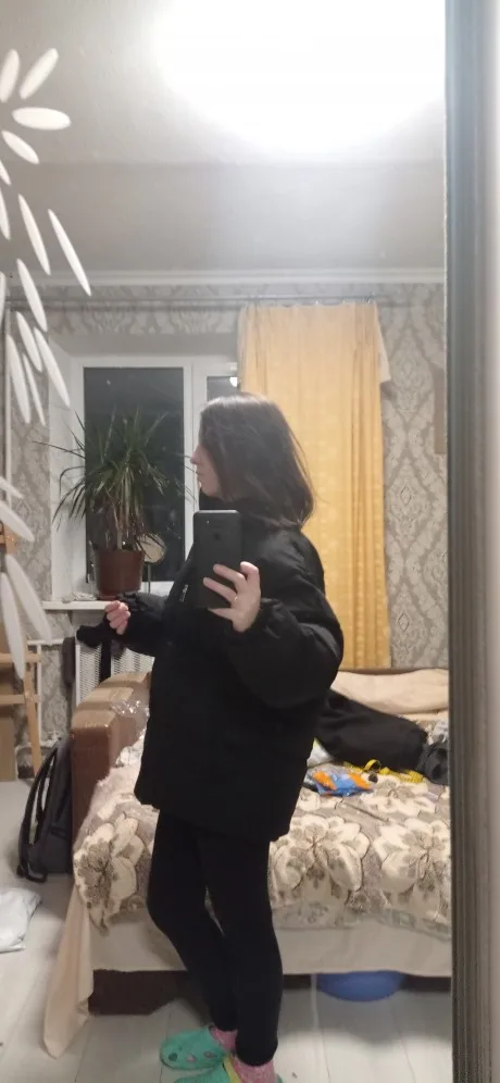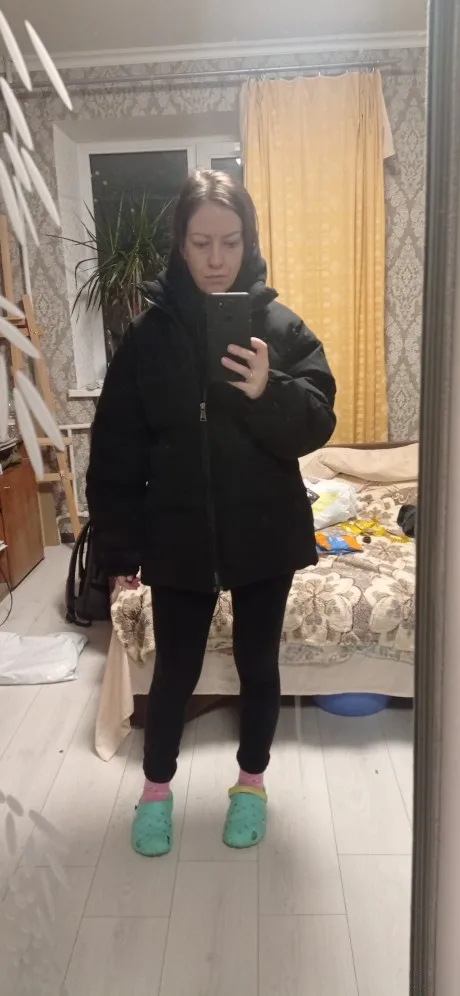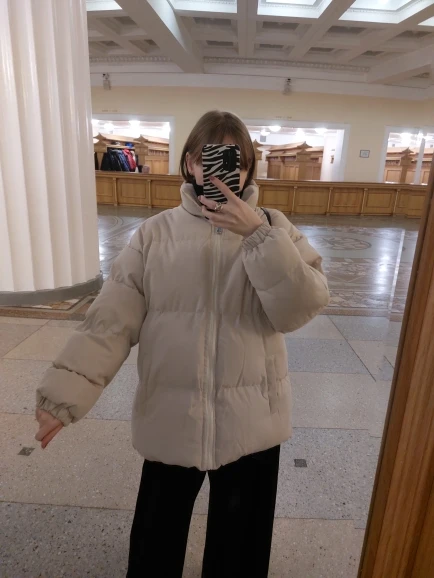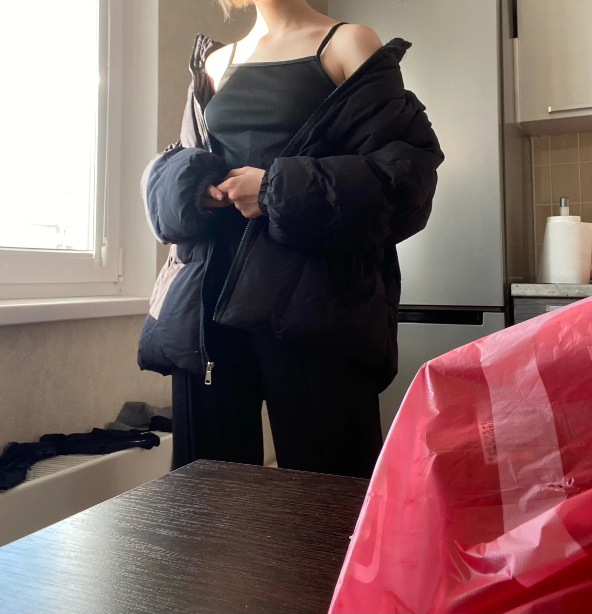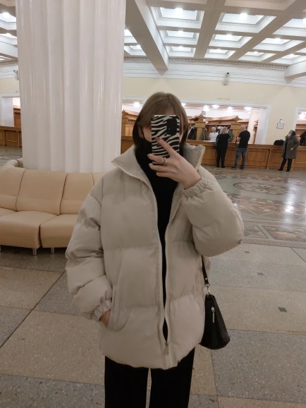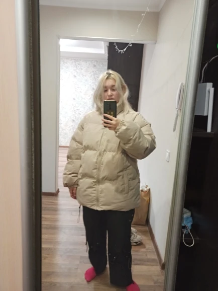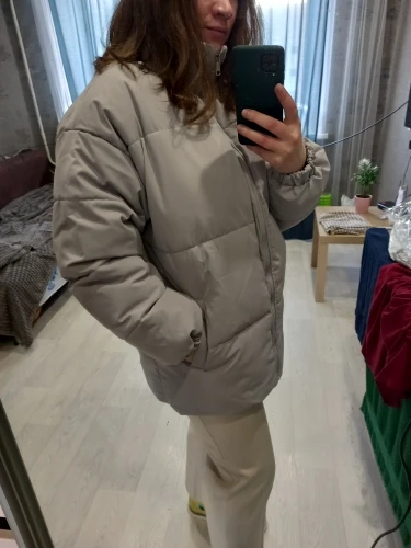 товар пришёл за месяц+ думала куртка будет чисто белая, как на картинке, а она бежевая :( начитавшись отзывов взяла на размер больше (у меня рост 160 и взяла L) по рукавам отлично, но вот смотрится не оч ( не люблю оверсайз) Внутри балоневая ткань, а снаружи какая-то шершавая (не разбираюсь я в тканях). На зиму точно не подойдёт, замёрзнешь, но если конечно одеваться как капуста, то наверное норм; это осень-весна. На фото цвет куртки кажется белым, но она бежевая, а так заказом довольна, спасибо ❤️
