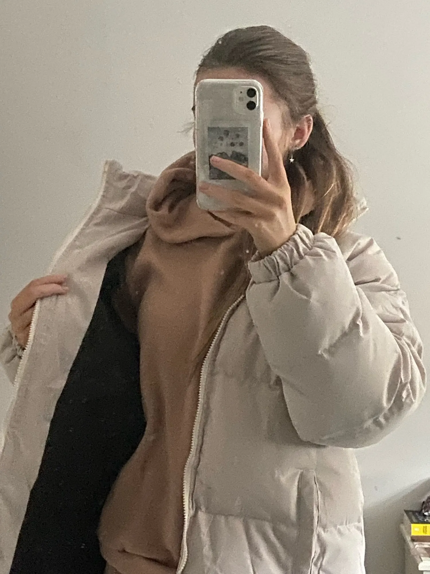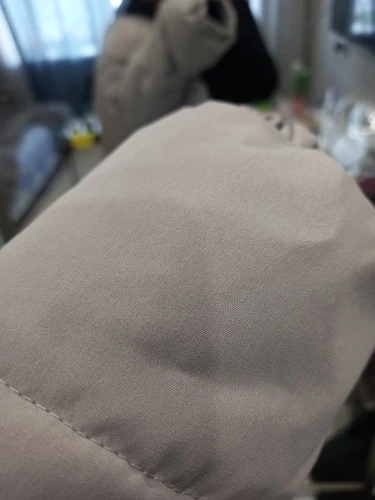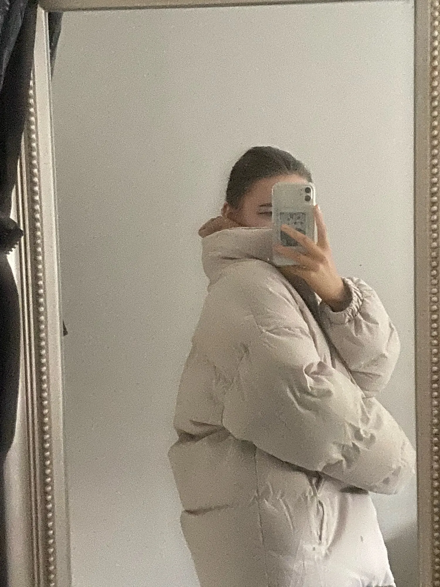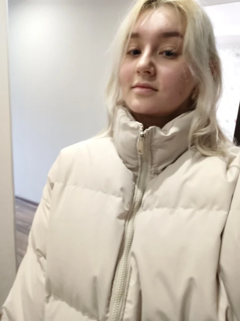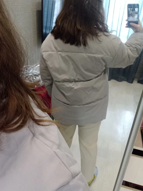 товар пришёл за месяц+ думала куртка будет чисто белая, как на картинке, а она бежевая :( начитавшись отзывов взяла на размер больше (у меня рост 160 и взяла L) по рукавам отлично, но вот смотрится не оч ( не люблю оверсайз) Внутри балоневая ткань, а снаружи какая-то шершавая (не разбираюсь я в тканях). На зиму точно не подойдёт, замёрзнешь, но если конечно одеваться как капуста, то наверное норм; это осень-весна. На фото цвет куртки кажется белым, но она бежевая, а так заказом довольна, спасибо ❤️