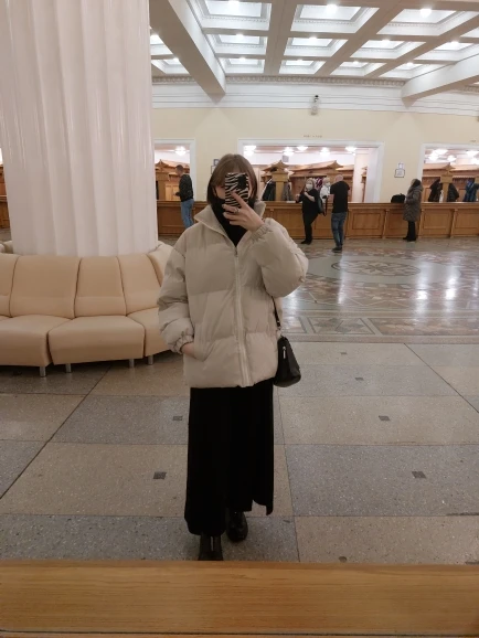 Куртка пошита идеально. Торчит одна нитка около бирки. Все сшито идеально. Лучшее качество. Выбирала белую молочного цвета. Приехала светло кофейная. Немного расстроилась. Но куртка подходит к обуви, по этому ладно. 3xl. на рост 162 см смотрится как на фото. Размер идеально подошел. Не очень подходит для зимы СНГ, до -20 -25. Но можно одеть под низ теплые вещи. Ощущается легкой, держит форму сразу после распаковки. Не общалась с продавцом. Я влюблена ❤️ На фото я очень запыхалась после похода на почту