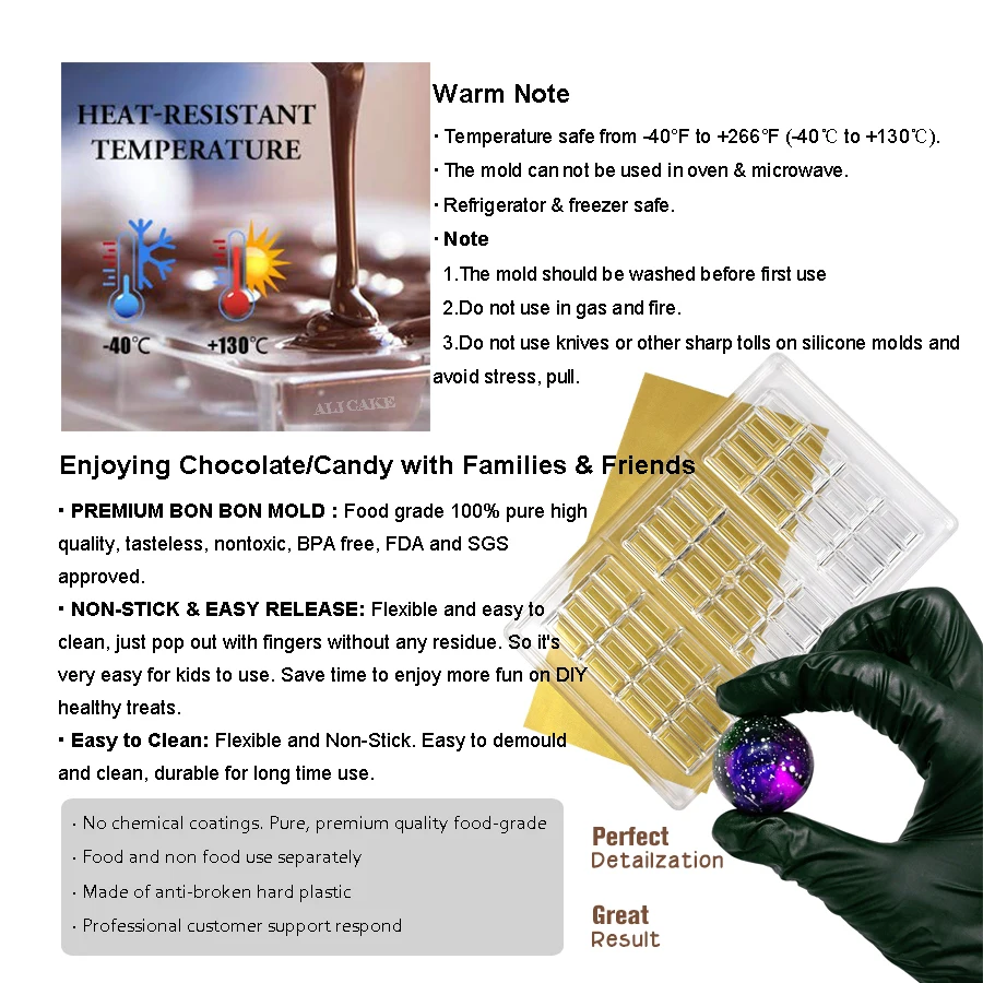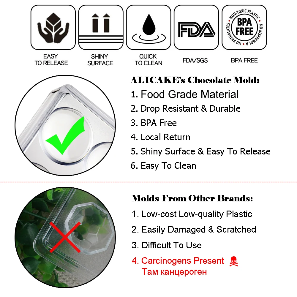 1. Используйте пищевые пластмассы, соответствующие FDA и SGS.2. Наши формы тяжелее, толще, прочнее и имеют более длительный срок службы!3. Отсутствие вредных веществ, обеспечение безопасности и здоровья!4. Мы осуществляем Бесплатные возвраты для многих стран!5. Наша поверхность формы гладкая и не подвержена царапинам.