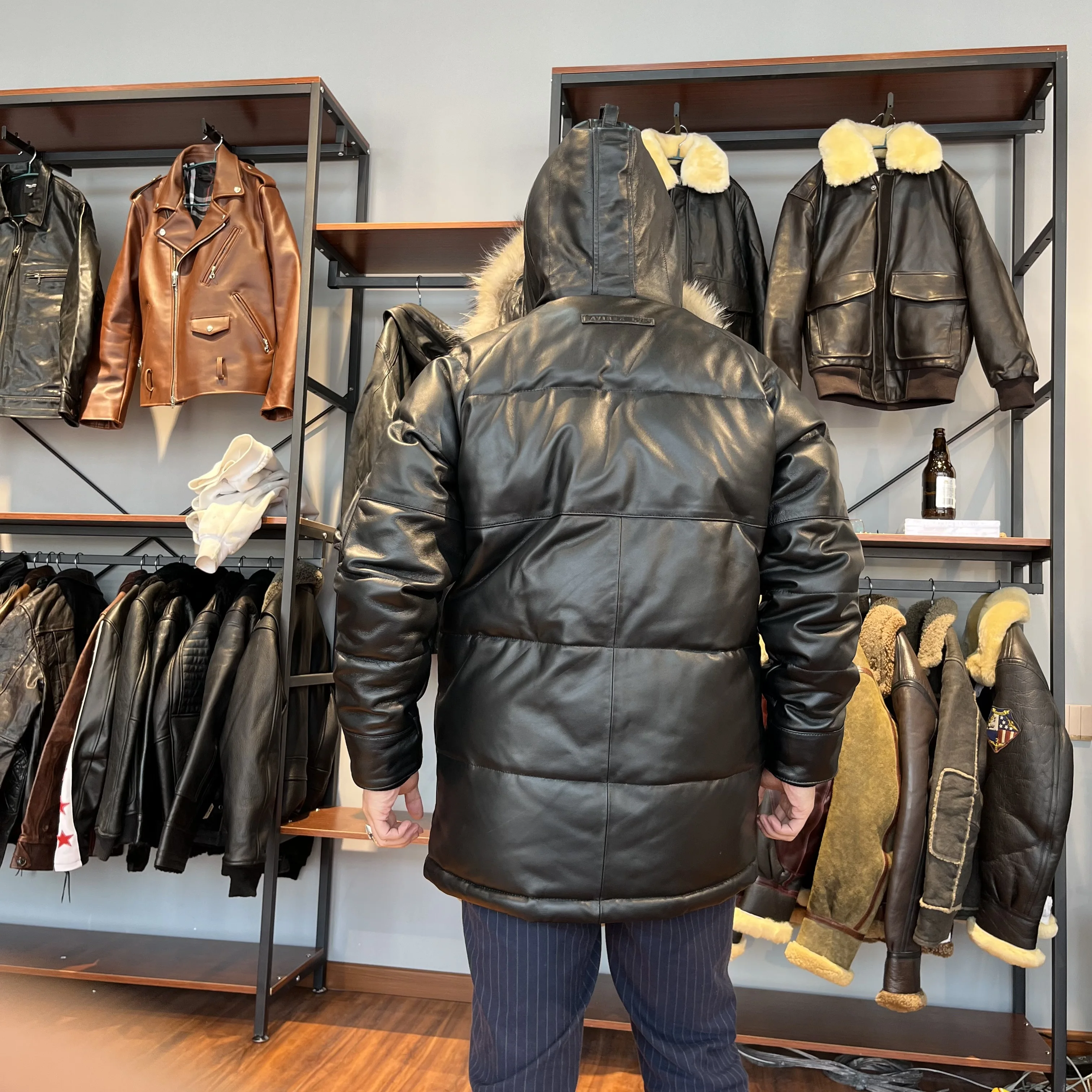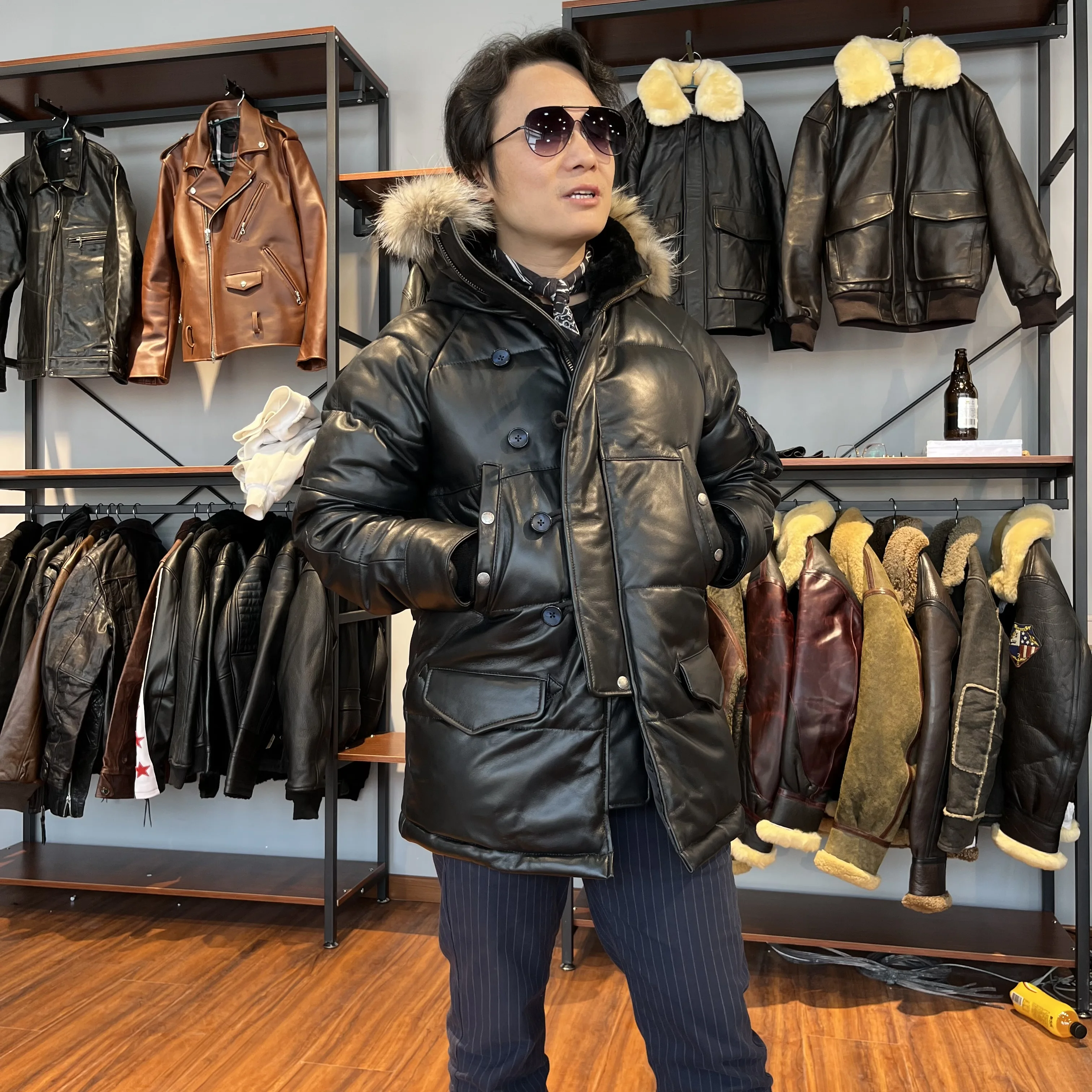 Мужская длинная куртка из натуральной овечьей кожи, с перьями