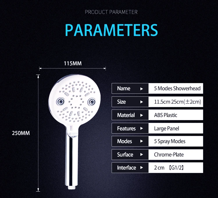 1. С 115 мм Большой панелью и дизайном кошачий глаз2. С пятью режимами выхода воды, многократное удовольствие3. Экономия воды и предотвращение утечки4. АБС композитный пластик, здоровый и экологически чистый, многослойное гальваническое покрытие, антикоррозийный и антикоррозийный, красивый и прочный5. Универсальный интерфейс G1/2, легко устанавливается