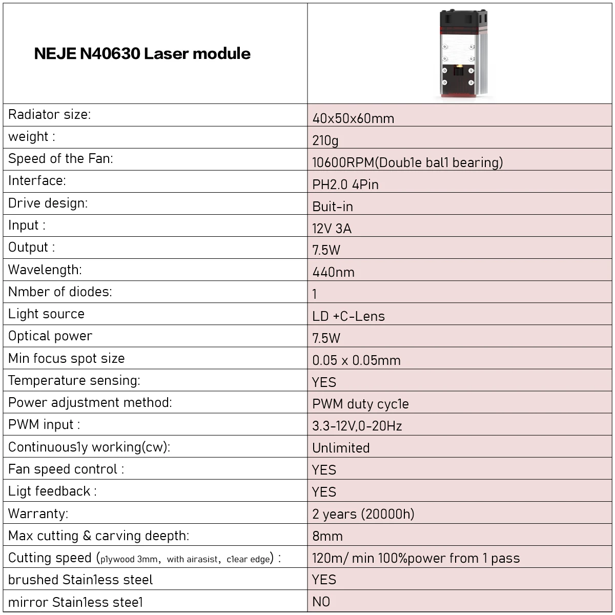 N40630 Laser Moudle Feature N40630- Designed for Laser Engraver, 3D printer, CNC mill, arduino project.- 7.5W Optical power output, 4mm plywood from 1 pass(speed 100)- More Safety, Built-in protective glass to protect eyes! Even without wearing protective glasses, the operation is more comfortable.- More Quiet, Intelligent drive adjust the cooling fan speed according laser temperature.- Easy use, Digital PWM wave pulse signal generator adjustable frequency duty cycle board for neje laser module.- slidable mounting fixture is provided for easy adjustment of focus.N40630 General SpecificationModel:NEJE Module N40630Heatsink Material:Aircraft Aluminum + Brass ShellLuminous Color:BlueSection Size:40mm x 40mmCooling Mode:Temperature sensor intelligent control + 10000 rpm 40mm cooling fanDimension:60 * 40 * 40mmAdapter Plug:5.5 2.1 portCan Engrave:MDF/Balsa/Paper/Wood/Fabric/Plastic/Leather/Plywood/Foam Paper/Anodized AluminumCan Not Engrave:Metal/Glass/Stone/Ceramics/PCB/Stainless Steel/Reflective Material/ Transparent MaterialTechnical Parameters:Module Input:30-40W (applicable power adapter: 12V3A/4A,12V*3A/4A=36W-48W)Optical power output:7.5W (7500mW)Wavelength:445-450nmBeam Shape:Dot (Focusable)Working Voltage:DC 12VTTL&PWM Modulation:YES, Compatible with Both TTL & PWM ModulationInput Voltage:DC12V 3A PWM/TTL Input:DC3.3V-12V Input Interface:PH2.0-4Pin (+,-, PWM/TTL, Temperature), 3Pin (+,-, PWM/TTL) , 2Pin+2Pin (+,-) + (PWM/TTL,-)NOTE:Temperature interface can be disconnected,NEJE provides text instructions for temperature acquisition on wiki.Drive Mode:External ACCSafe temperature range:<60 ℃Module weight:202g ( The lighter the weight, the smaller the move inertia, the better the performance )Life Time:10000-20,000 hours