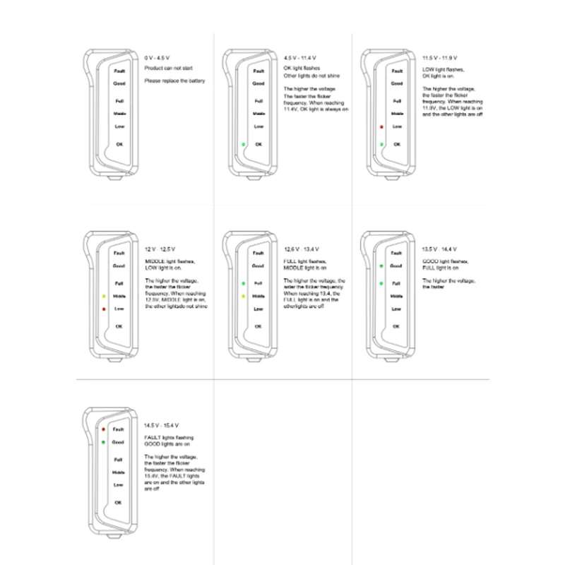 Особенности:Проверка состояния генератора.Проверка состояния батареи.Дисплей перегрузки батареи.6-светодиодный дисплей, четко отображает состояние генератора и аккумулятора.Два зажимы для тестирования для безопасной и легкой эксплуатации.Небольшой размер и вес светильник, удобно носить с собой.Подходит для автомобилей, мотоциклов и т. д.Подходит для 12 В свинцово-кислотных батарей, твердых батарей, разрядных батарей и батарей без технического обслуживания тяжелых изолированных хомутов.Легко и безопасно в использовании, без искры.С хорошим чипом внутри, не легко получить горячее на поверхности. 6 светодиодных ламп:Проверка состояния генератора:Первый светильник (красный): неисправностьВторой светильник (зеленый): хорошийТретий светильник (зеленый): полныйПроверка состояния батареи:Первый светильник (желтый): СреднийВторой светильник (красный): низкийТретий светильник (зеленый): ок Спецификация:Количество СВЕТОДИОДНЫЙ: 6 (2 красных, 3 зеленых и 1 желтых)Материал провода: 0,06 квадратных миллиметров медиМакс. Напряжение и ток: 12 В 15AДлина провода: 25 см/9,84 дюймаРазмер тестера батареи: 12*5,2*1,8 см/4,7*2 * 0.7inХарактеристики: портативныйФункции: повышение безопасности вожденияМатериал: пластик, медьЦвет: серый