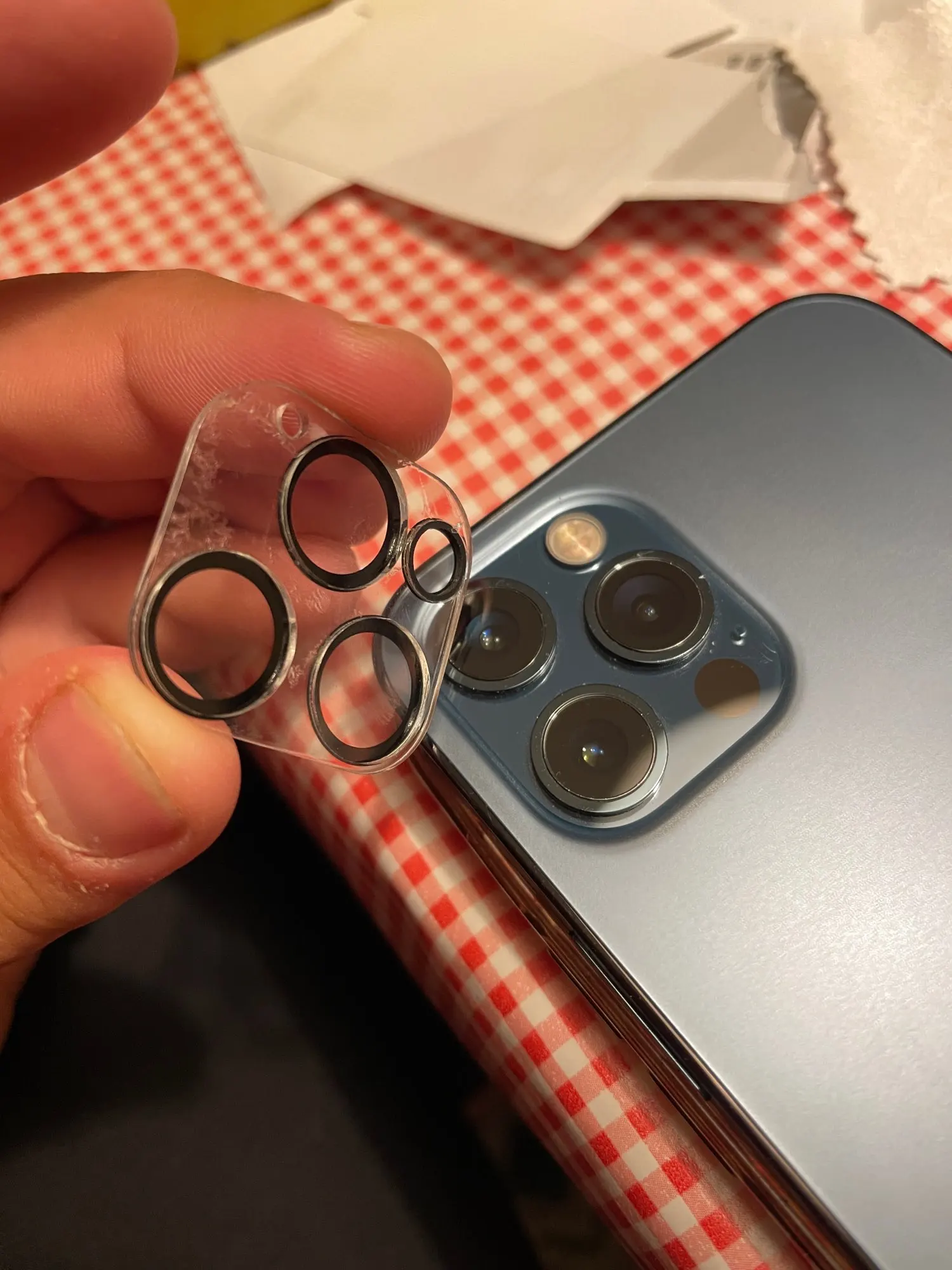 Если вы планируете носить защитный чехол, не советую покупать протектор на камеры, так как он очень сильно выпирает и не посещается ни в один чехол. Я его отклеила в итоге. Так к продукту претензий нет, качество хорошее! В наборе идёт салфетка и дезинфектор для стекла для лучшего наклеивания