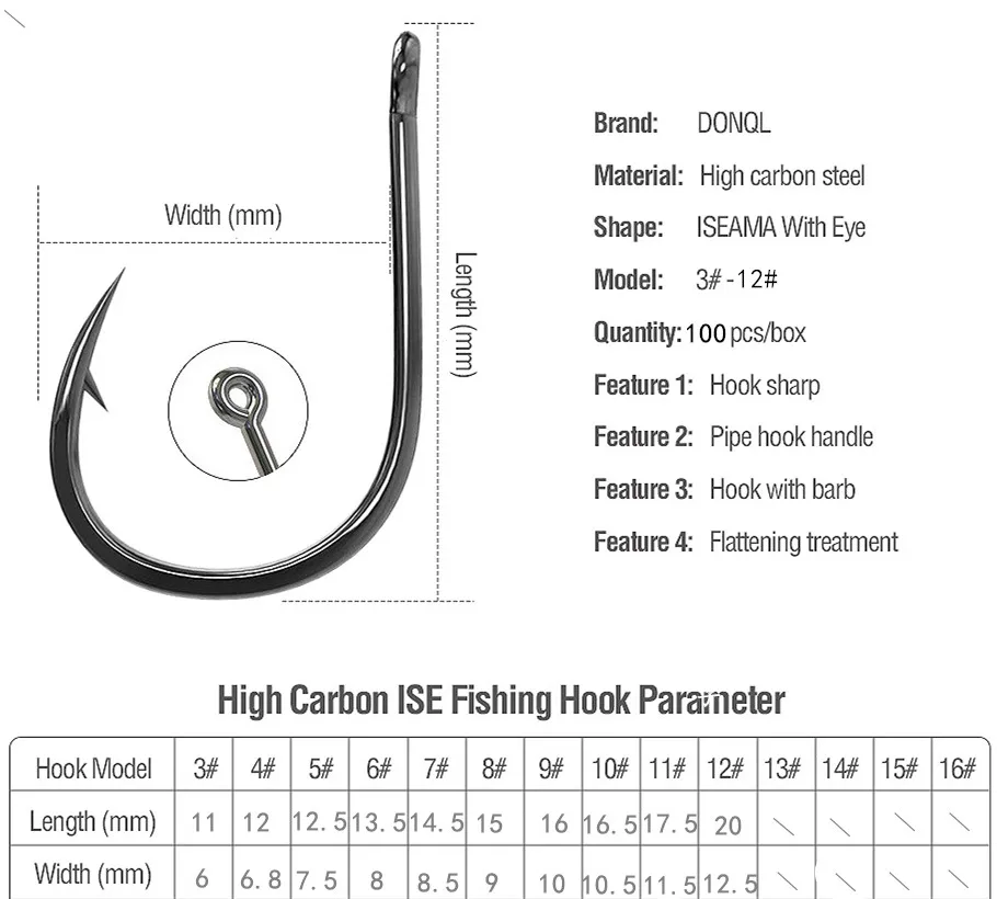 ①Включает в себя 100 штук рыболовных крючков для вас, выбирая различные размеры от 3 # до 12 #.