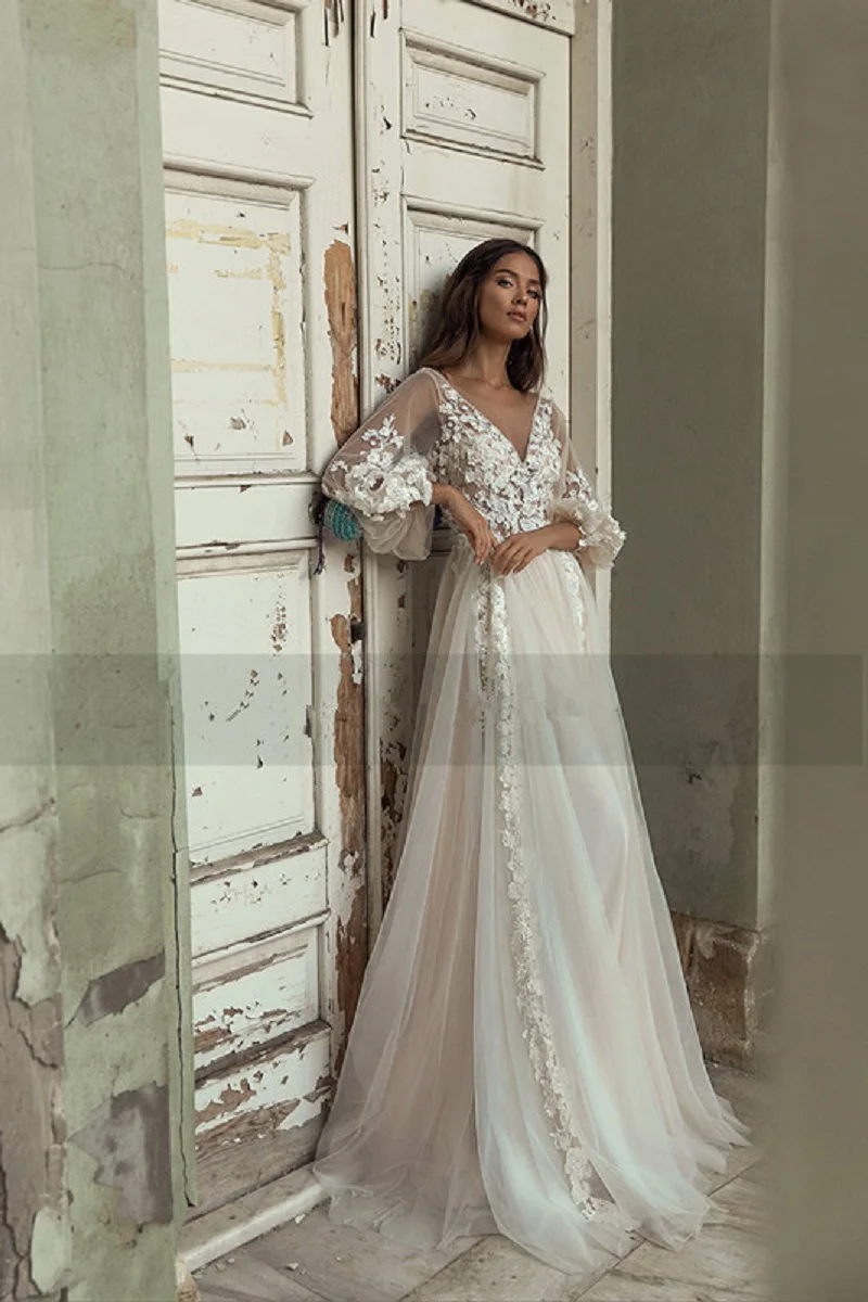 Шифоновое свадебное платье в стиле бохо, с длинными пышными рукавам...