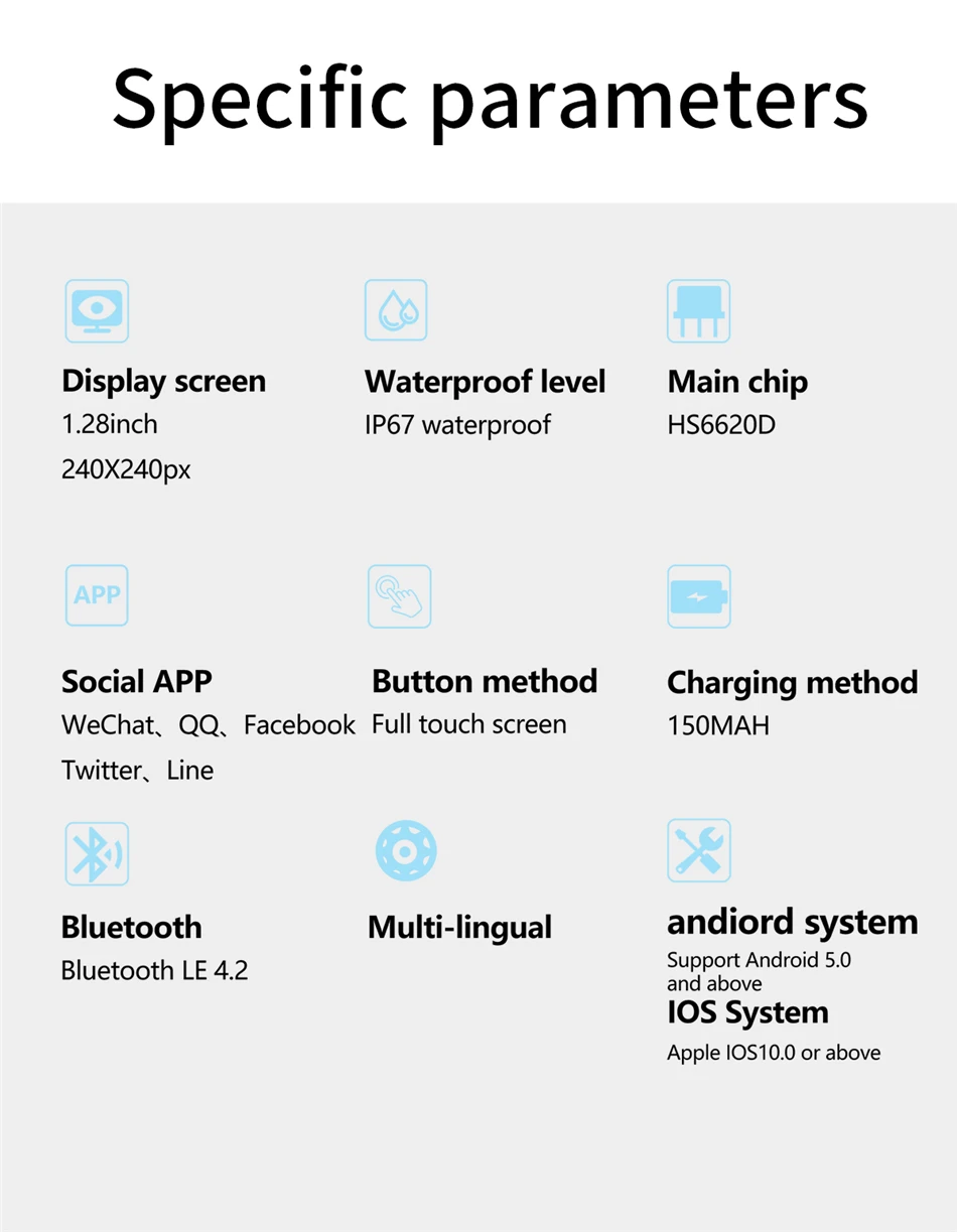 Отображение времени, шаг, расстояние, калории, частота сердечных сокращений/кровяное давление/кислород, контроль музыки BT, мониторинг сна, напоминание о звонках, SMS оповещения, напоминание о сообщениях в социальных приложениях (поддержка WeChat, QQ, Facebook, Twitter, Line, Whatsapp, Instagram и т. д.), будильник, напоминание о сидячем положении, Спорт (скакалка, бег, сидение, настольный теннис, баскетбол, бадминтон альпинизм и т. Д.) Поверните запястье и сияйте экран, ищите браслеты, ищите телефоны, удаленная фотография, отказ от звонков, не беспокойтесь, переключение с несколькими циферблатами