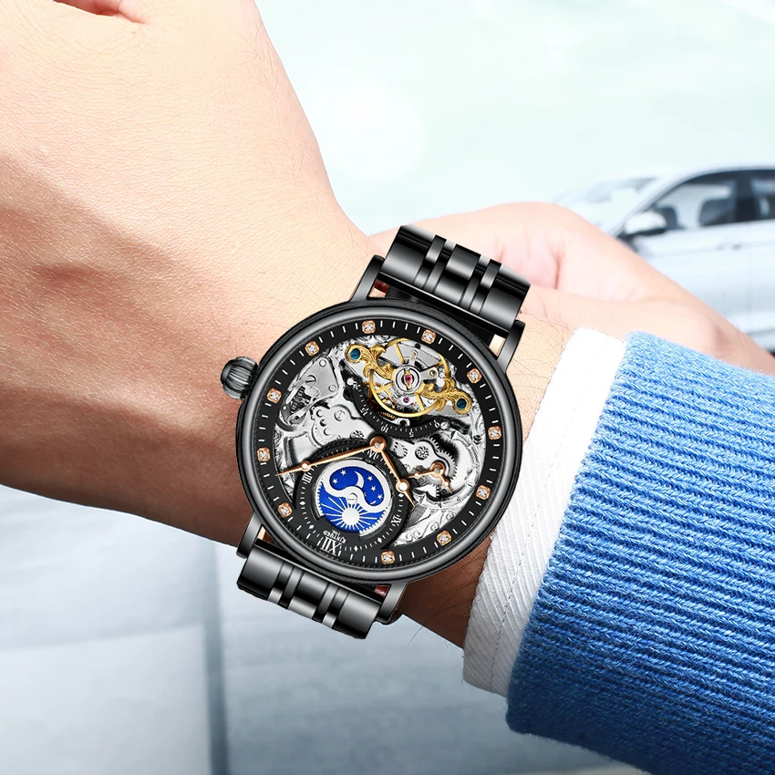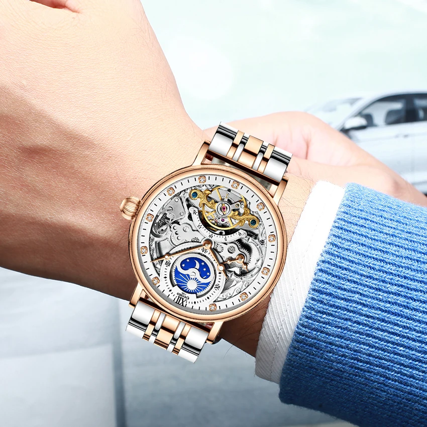 KINYUED деловые Tourbillon механические часы, автоматические часы, мужские роскошные брендовые наручные часы Moon Phase, полностью стальные часы Relojes Hombre