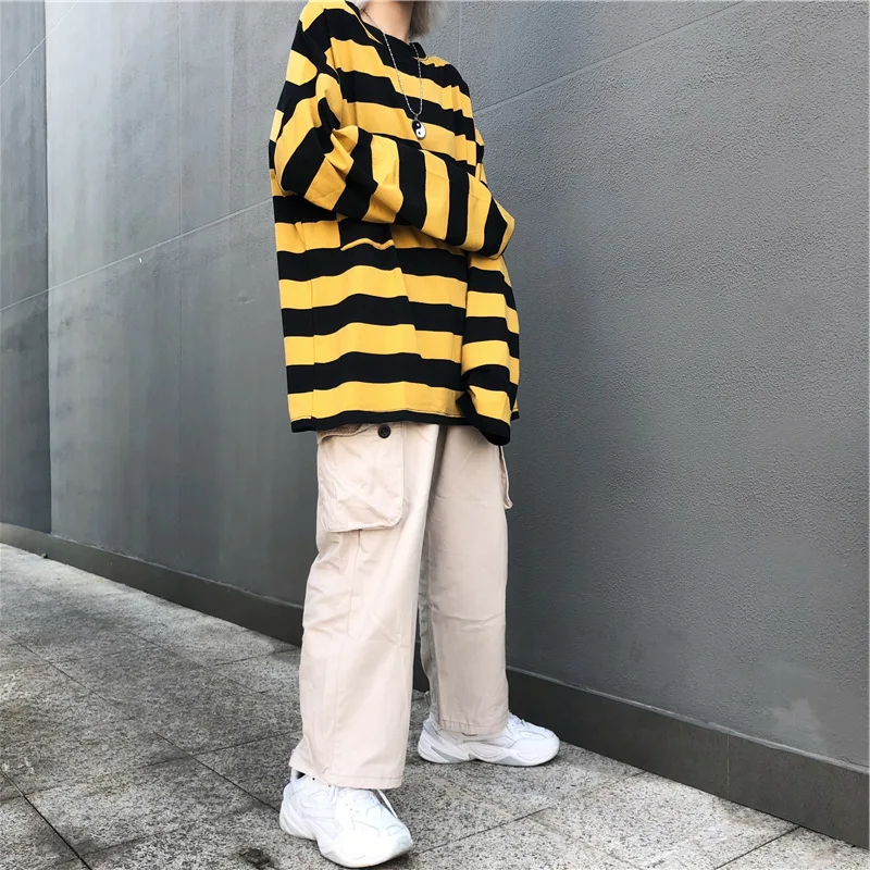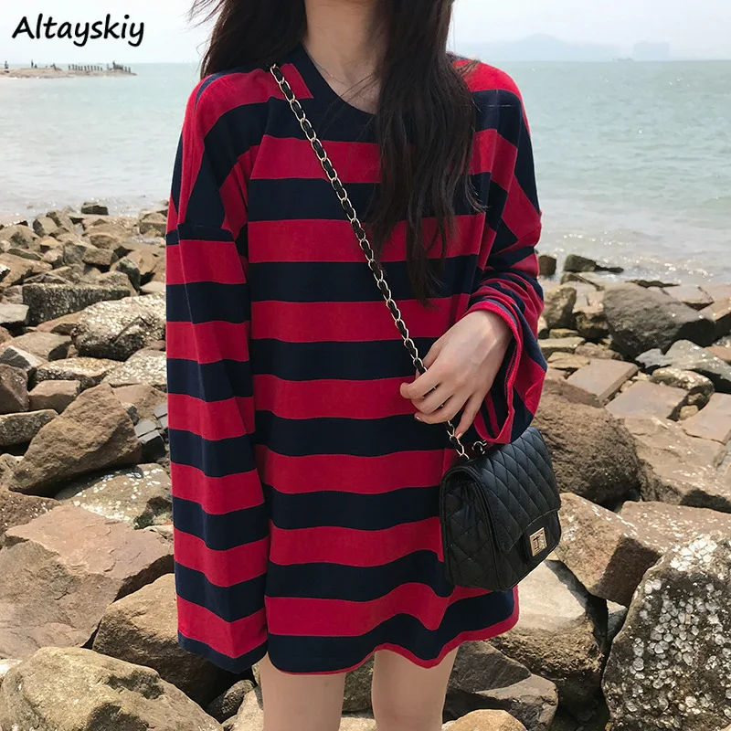 Женская футболка, красная, в полоску, свободная, универсальная, модная, повседневная, с длинным рукавом, для осени, 2020