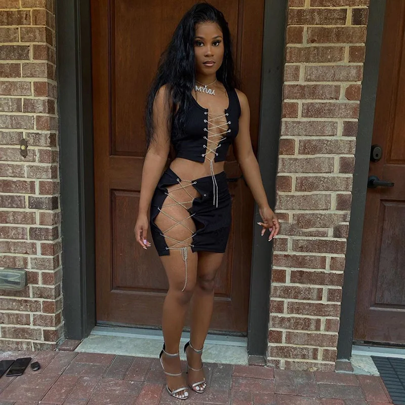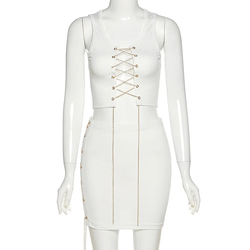 Осенний бандажный кроп-топ без рукавов и мини-юбка на шнуровке