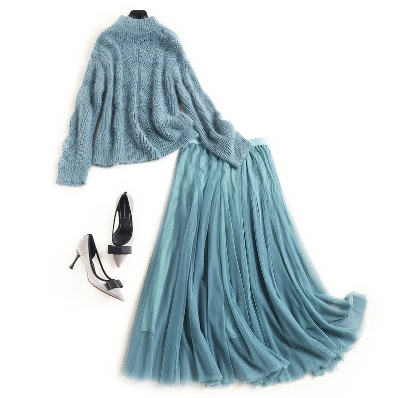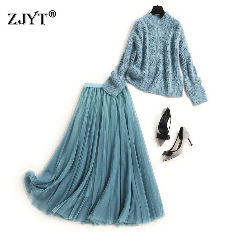Высокое качество, модный осенне-зимний женский подиумный костюм, пуловер с длинными рукавами, свободный свитер и сетчатая юбка, комплект из двух предметов