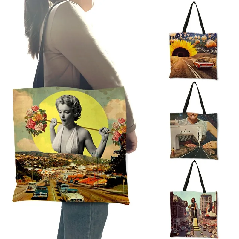 Экологичная многоразовая сумка для покупок, женские тоуты с рисунко...