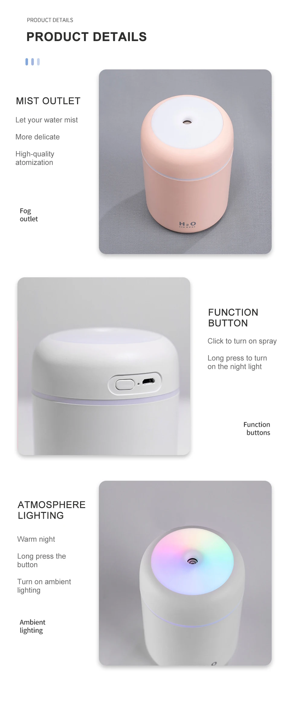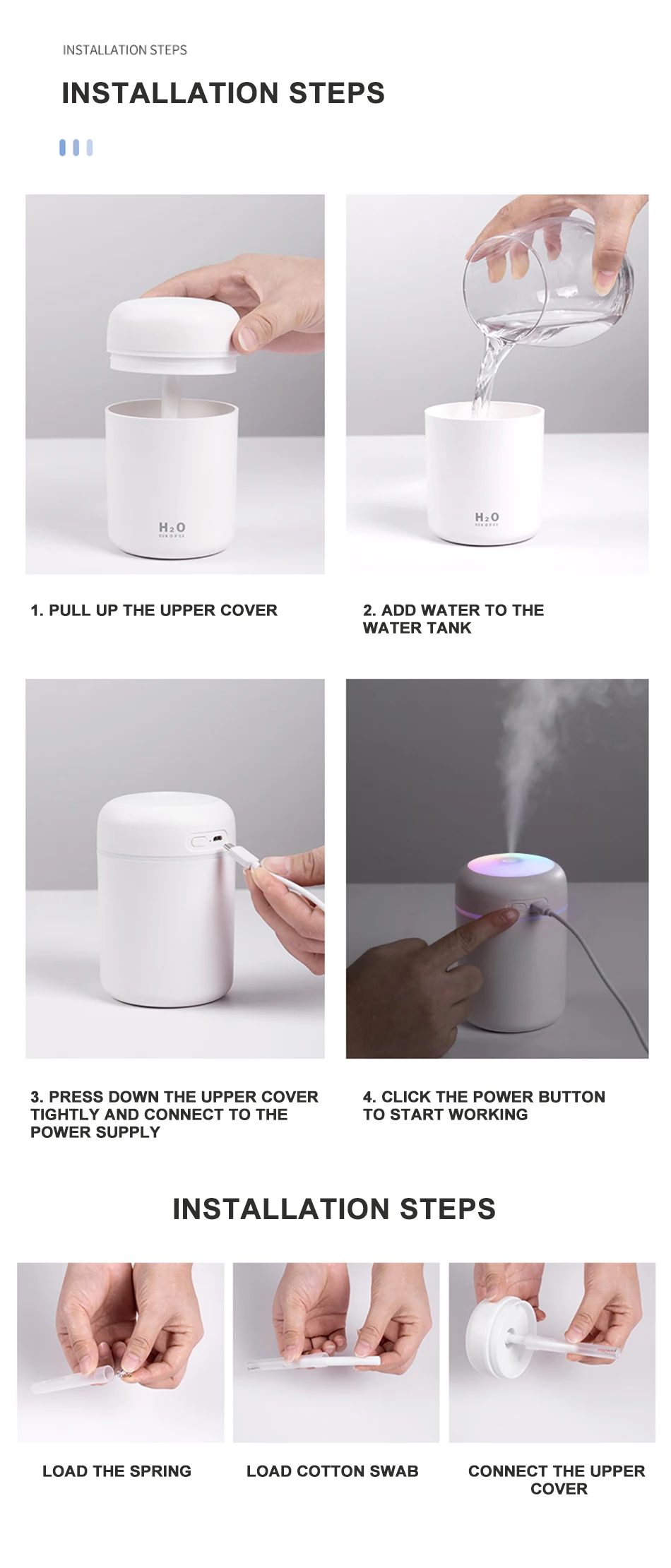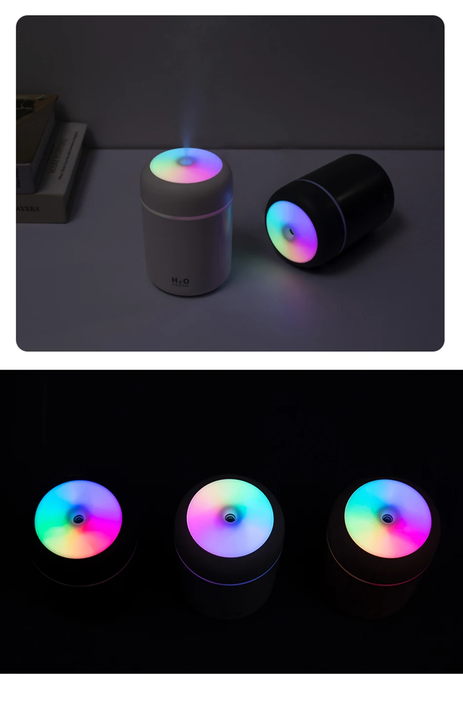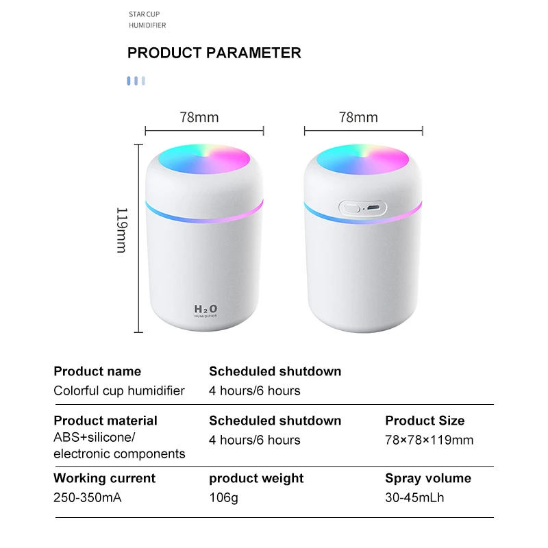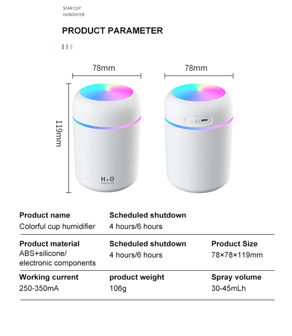 Спецификация: Название продукта: увлажнитель с чашкой dazzle Регулярное отключение: 4 часа/6 часов Материал: АБС-пластик + силикон/электронные компоненты Номинальный вход: 5,0 В постоянного тока/1,0 А Размер продукта: 78x78x119 мм Рабочий ток: 250-350 мА Вес продукта: 106 г Объем распыления: 30-45 мл Операция распыления: Нажмите кнопку питания, запустите Режим непрерывного распыления; Нажмите еще раз, чтобы запустить режим прерывистого распыления (включение 3 секунды, остановка на 3 секунды); Нажмите кнопку для закрытия. Работа ночных ламп: Нажмите кнопку питания в течение 3 секунд, чтобы включить теплый белый режим ночника; Нажмите кнопку еще раз в течение 3 секунд, чтобы запустить режим постепенной смены 7 цветов; Нажмите кнопку в течение 3 секунд, чтобы закрыть светильник. Упаковка: 1 * увлажнитель 1 USB зарядный провод 2 * ватный тампон 1 * Инструкция по эксплуатации