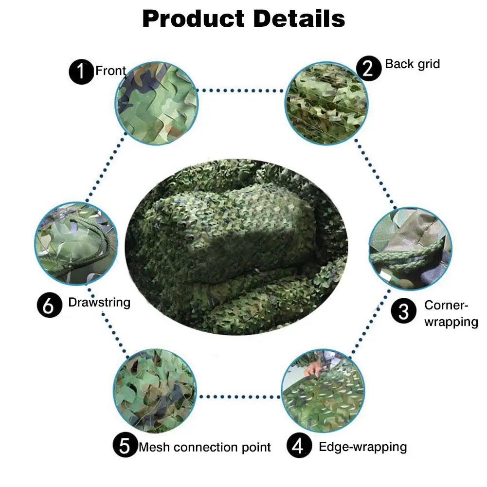 1. Высококачественная ткань: камуфляжная сетка оснащена тканью Оксфорд 210D, которая усилена веревкой, сеткой сзади, она с несколькими небольшими петлями, размещенными вокруг края для крепления.2. Легко носить с собой: камуфляжная сетка легкая и удобная для использования.3. Широкое применение: камуфляжная сетка оснащена эффективным 3d-материалом для смешивания в листьях. Камуфляжная сетка подходит для кемпинга, стрельбы, скрытия, затенения, сценических фонов, украшения и камуфляжа.4. Многоцелевое назначение: камуфляжная сетка может построить зону уединения для детей, которая предназначена для защиты уединения и Рождественского украшения.5. Дополнительные стандарты: есть 2 стандарта на выбор, включая размер одного слоя (около): 2 м x 3 м/78,74x118,11 дюйма, 2x5 м/78,74x196,85 дюйма, 3 м x 4 м/118,11x157,48 дюйма, 3 м x 5 м/118,11x196,85 дюйма, размер двойного слоя (приблизительно): 3 м x 4 м/118,11x157,48 дюйма.