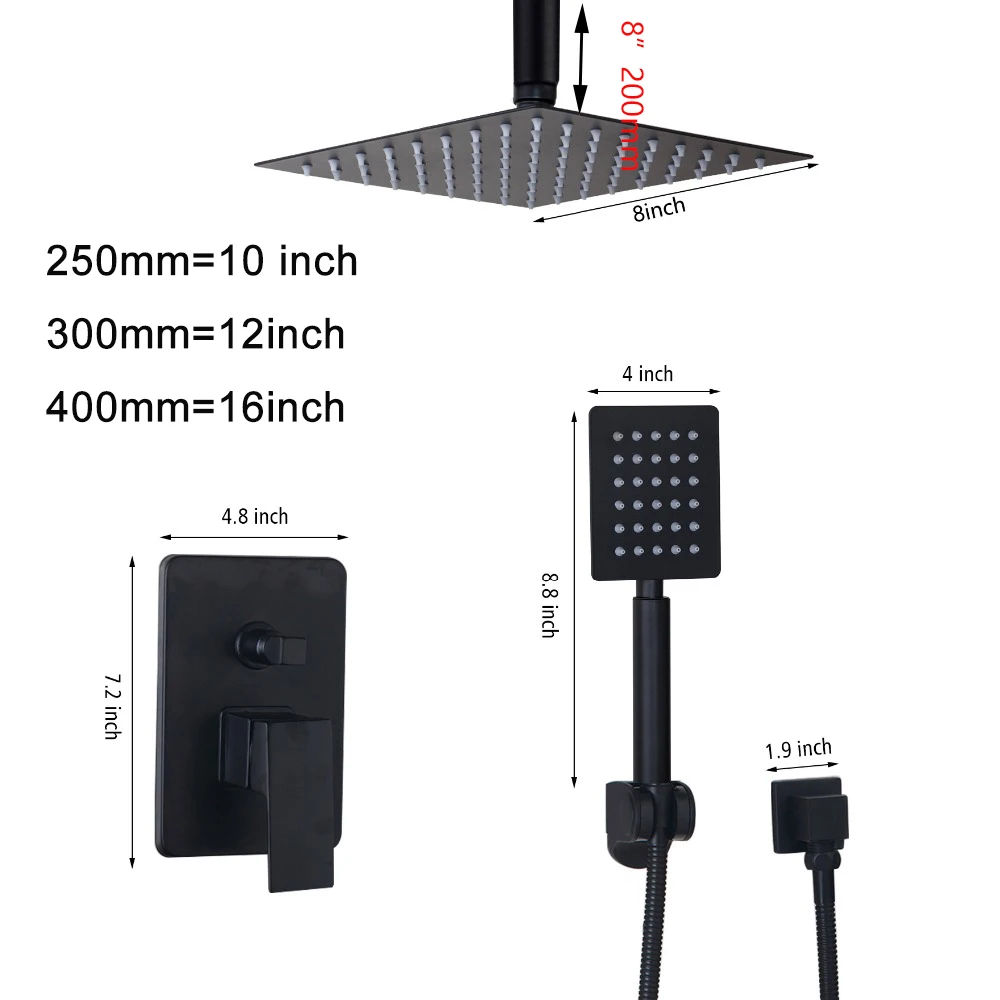 JIENI НовыйМатериал верхней головки: нержавеющая стальМатериал душевой ручки: нержавеющая стальМатериал ручного душа: латуньОтделка: черная живописьТип установки: потолочное креплениеТип управления холодной/горячей водой: один держатель двойной контрольРазмер верхней головки: 8/10/12/16 дюйма 200 мм/250 мм/300 мм/400 ммРазмер верхней головки светодиодного светильника: 8/12/16 дюйма 200 мм/300 мм/400 ммДушевой рычаг 8 "/200 ммДвухходовой смесительный клапанРазмер соединения: G1/2"Керамический дисковый картридж без капель для плавной и длительной работыСовершенно новый, в коробке, готов к отправкеЛегко моется. Можно очистить мягким мылом, чтобы обеспечить непотускнеющий блескПоставляется с гарантией на производство 24 месяца