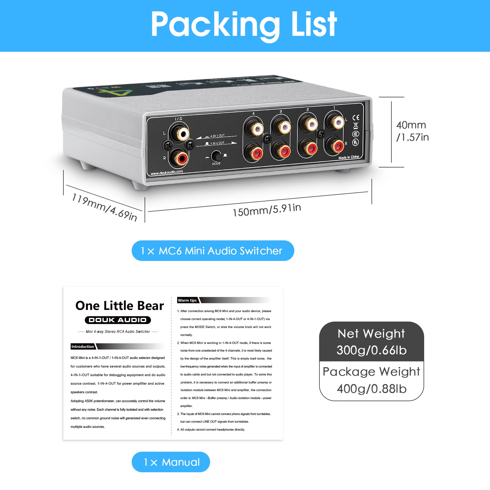 Стандартный интерфейс RCA совместим с большинством аудиоустройств, принимает пассивную конструкцию цепи, нет необходимости в источнике питания или любой установке, просто подключите Все входные и выходные аудиоустройства к MC6 Mini, plug and play. И с функцией отключения звука одной кнопкой, более удобный в использовании.