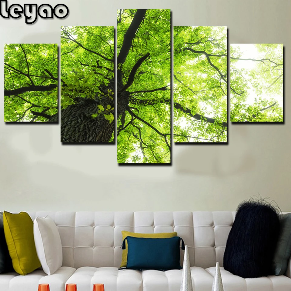 5 шт., полностью квадратная/круглая Алмазная картина, вышивка, дерево, листья, ветка, зеленые стразы, мозаика, вышивка крестиком, Декор, подарок